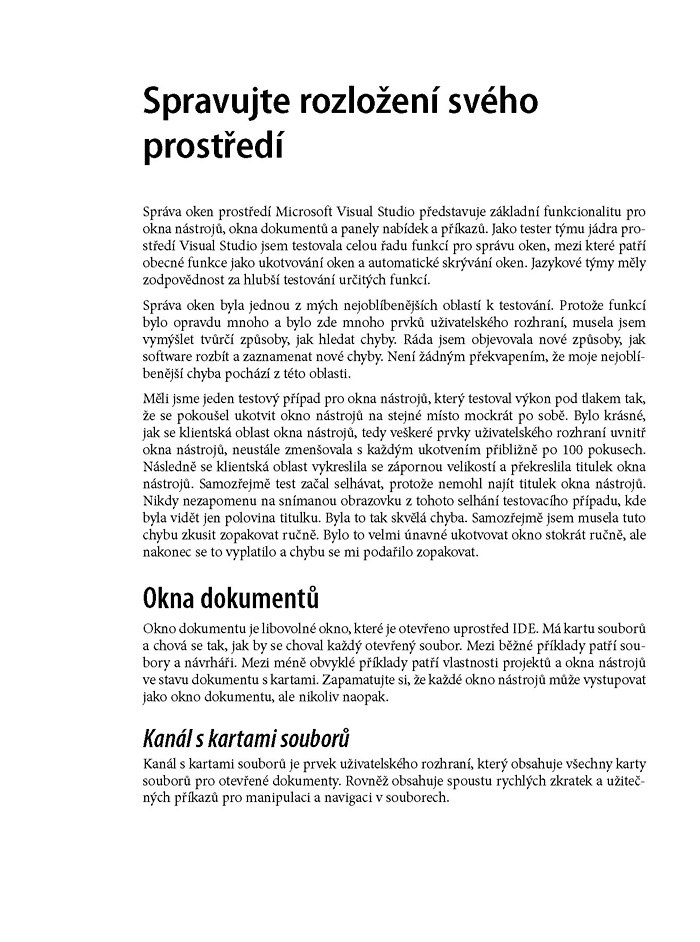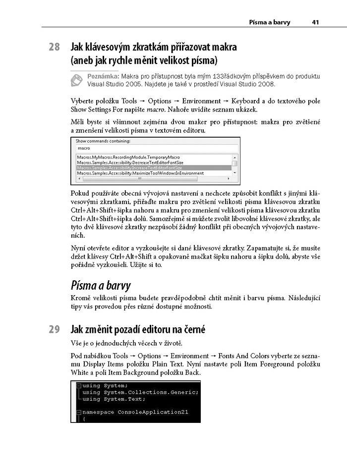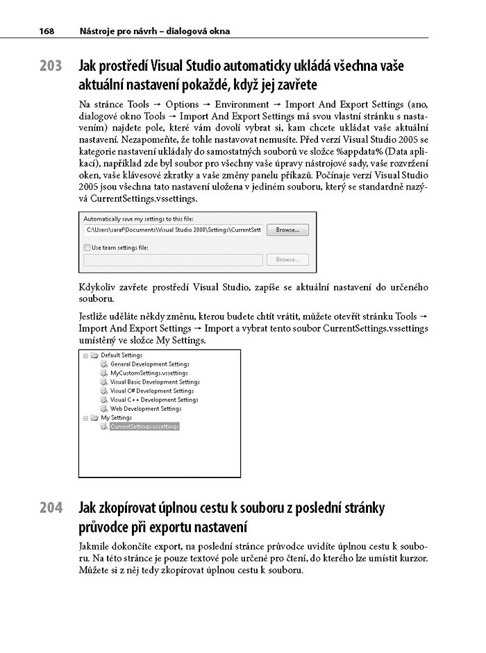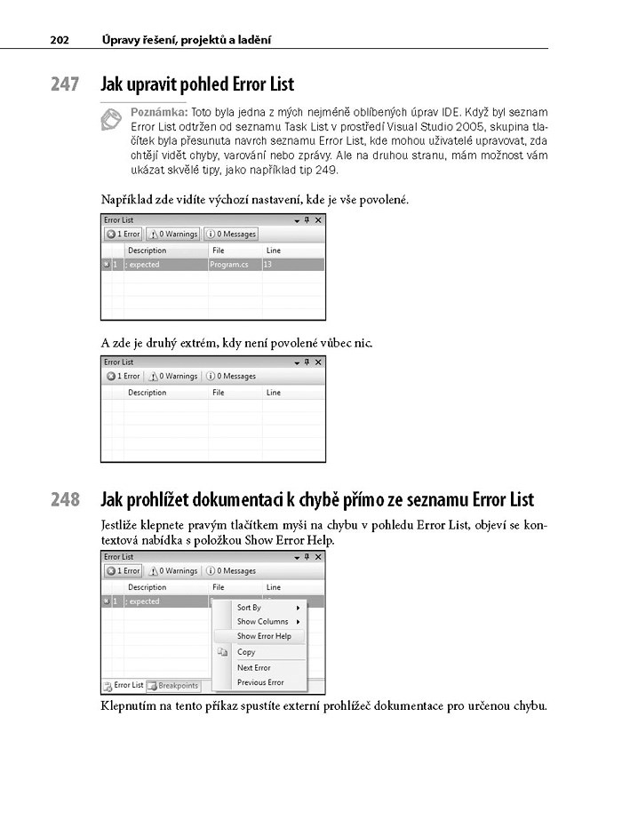 Publikace přináší celých 266 tipů a triků, jak si spolupráci s Visual Studiem co nejvíce přizpůsobit podle osobních preferencí. Naučí vás, jak mnohé úkony provést elegantněji a efektivněji. Ukáže vám celou řadu nástrojů, o kterých jste dosud nevěděli. Rady a návody jsou řazeny do vzájemně souvisejících celků, na chytrý trik tak často navazuje další, který jej rozvine. Díky tomu se dozvíte řadu triků, jež by vás nikdy ani nenapadlo hledat.