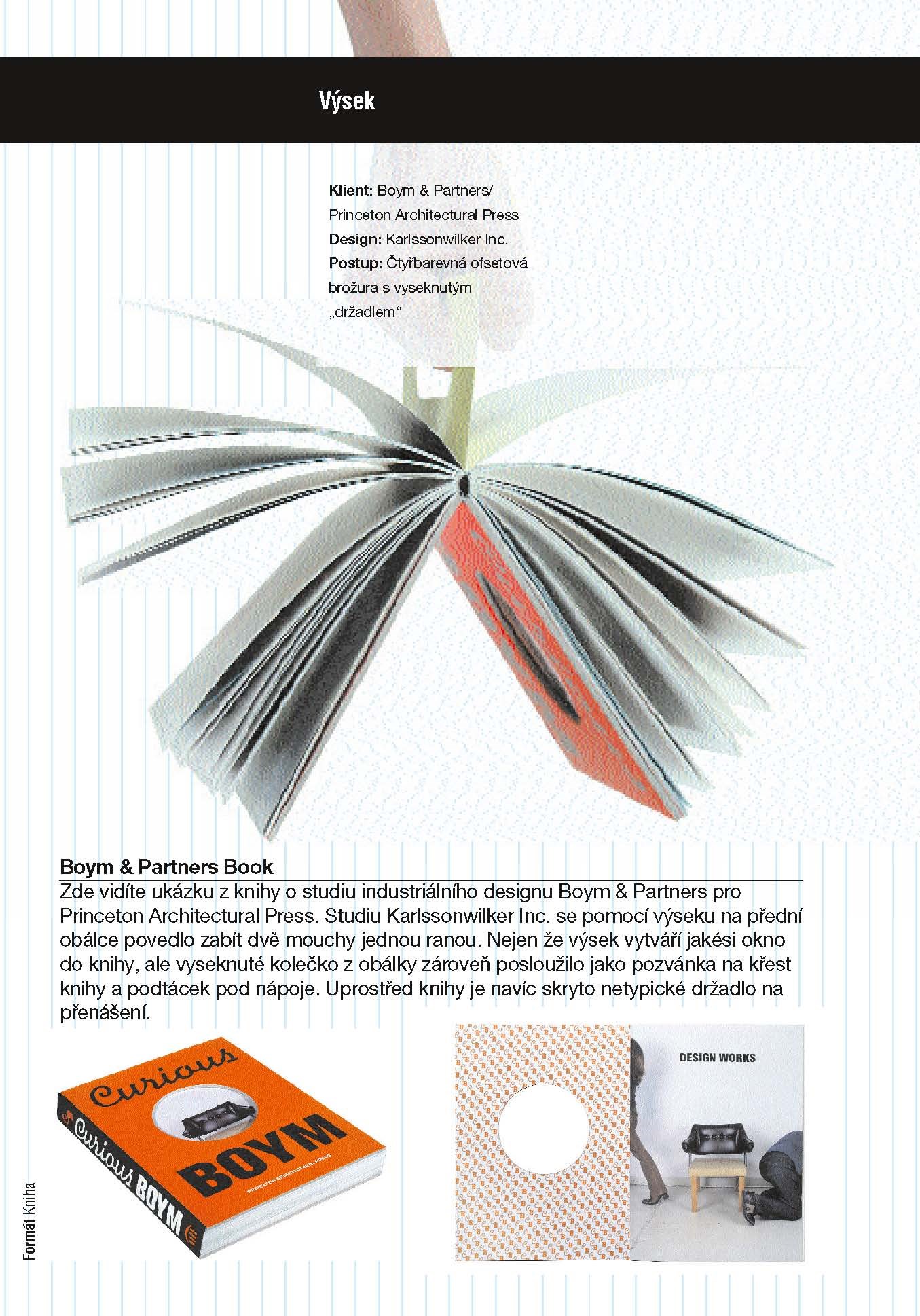 Probíraná témata: Typy papíru • Knižní formáty • Archová montáž • Druhy vazeb • Záložky (chlopně) • Knižní pouzdro • Výsek • Měřítko • Harmoniková vazba • Harmonikový sklad • Okénkový sklad a rozkládačky • Prosvítání • Parciální lak • Vkládání • Balení plakátů • Merkantilie • Tiskové techniky • Perforace • Velikost • Odkrývání • Forma následuje funkci • 16mm film • Navigace • Rolování • Obálky • Pásky • Rozkládací stránky • Skládání • Křížové skládání • Řád či nahodilost • Vlepované přílohy • Volné listy • Vytlačení a vtlačení • Duální narace • Iluze • Semiš • Animovaná kniha
