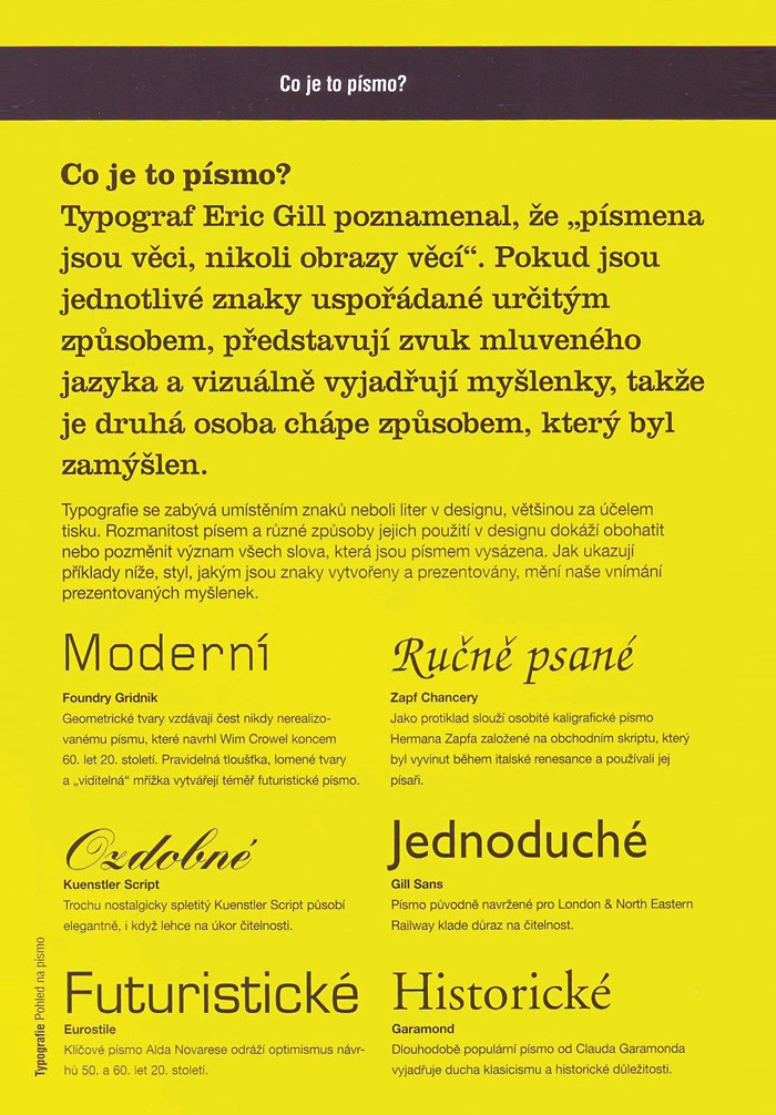 Probíraná témata: Kde se písmo používá * Písma a fonty * Styl písma * Anatomie písma * Lomená písma * Antikvová písma * Grotesková písma * Skriptová písma * Grafická písma * Písmové rodiny * Sazba textu * Používání více písem * Textová hierarchie * Písmo na stránce * Číslice * Verzálky a mínusky * Iniciály * Speciální znaky * Slitky * Správná úloha vyžaduje správné znaky * Interpunkce * Neabecední (obrázková) písma * Nelatinková písma * Proklad * Prostrkání * Kerning * Přetisk a vykrojení * Čitelnost a čtivost * Vytváření písem * Ručně kreslené písmo * Vytváření znaků * Realizace písma * Tiskové techniky * Vytlačení (embosování) a vtlačení * Fóliová ražba * Lakování * Písmo v praxi * Spojení obrazu a textu