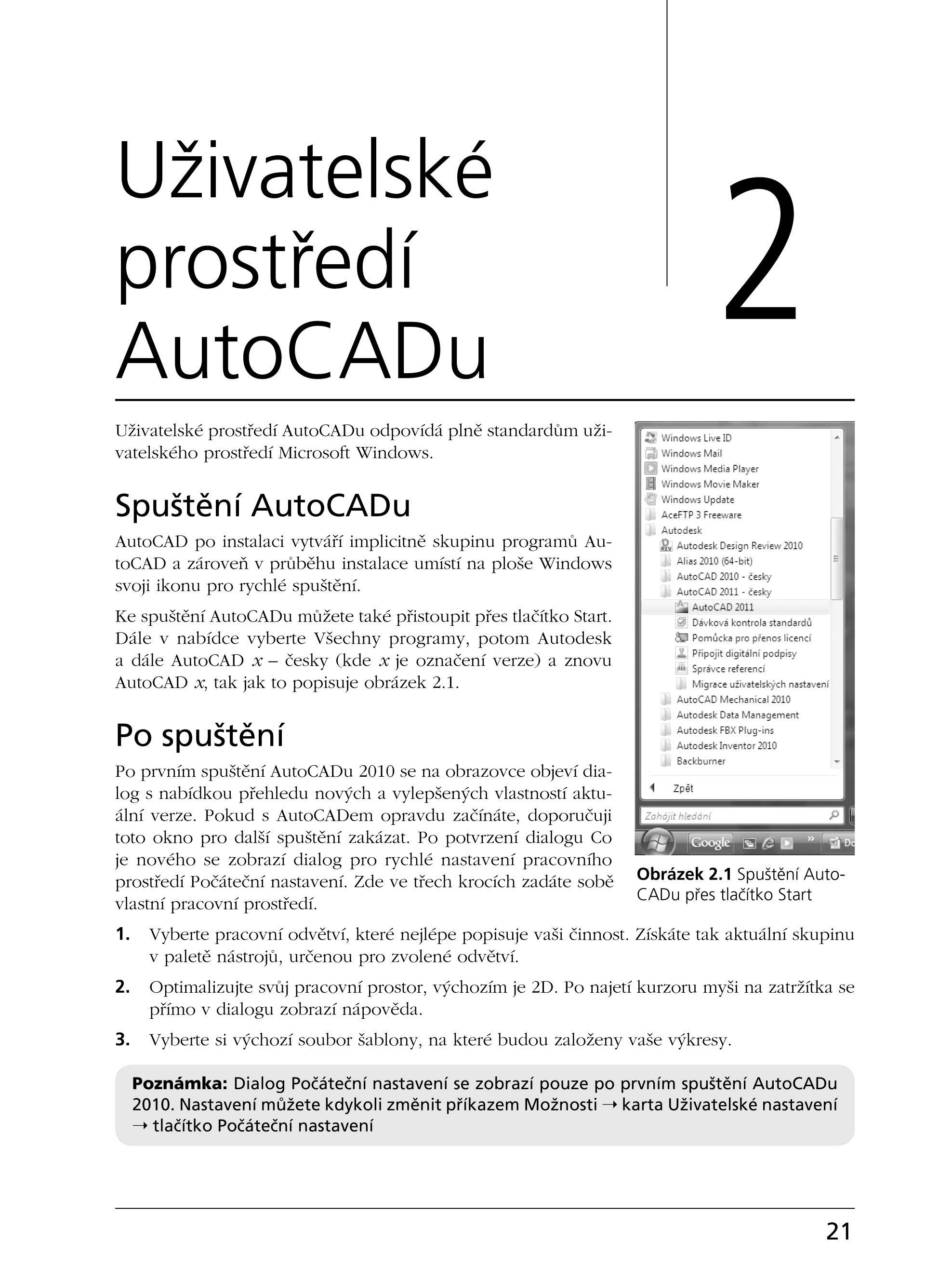 Průvodce pro verze 2010 a 2011 obsahuje kompletní přehled ovládání programu, názorné ukázky jeho využití pro každodenní práci a spoustu cvičení, v nichž si vyzkoušíte tvorbu reálných úkolů z praxe. Postupně se tak naučíte vše, co pro zpracování výkresové dokumentace skutečně potřebujete. Kniha je určena jak začínajícím uživatelům, kteří AutoCAD teprve poznávají, tak těm, kdo již znají jeho předchozí verze a potřebují se rychle zorientovat v nových funkcích a nástrojích. Autoři se mimo jiné věnují těmto tématům:
