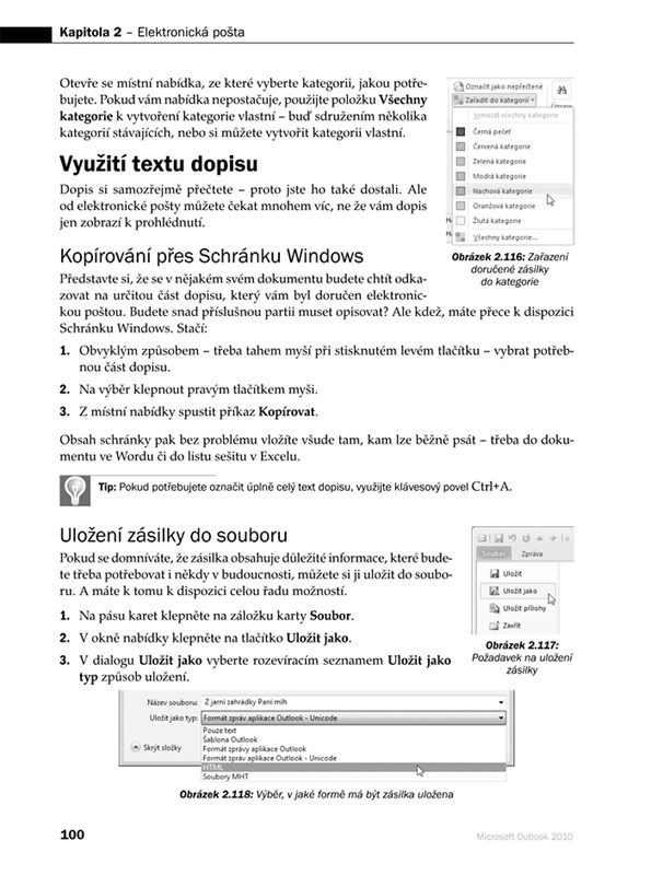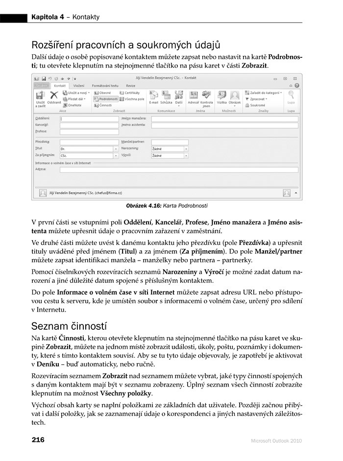 Podrobná uživatelská příručka, nejpodrobnější publikace o Outlooku z pera českého autora, vás naučí, jak s jeho pomocí efektivně organizovat svůj pracovní čas. Přehledně strukturovaný výklad nepopisuje suše uživatelské rozhraní, ale je orientován na konkrétní činnosti a dosažení praktických výsledků. Doplňuje ho množství ilustrativních obrázků, tipů, upozornění na možná úskalí, přehled užitečných klávesových zkratek a nového rozhraní pro ty, kteří na Outlook 2010 přecházejí z verze 2003 a starší. Kniha se mimo jiné věnuje podrobně těmto tématům: