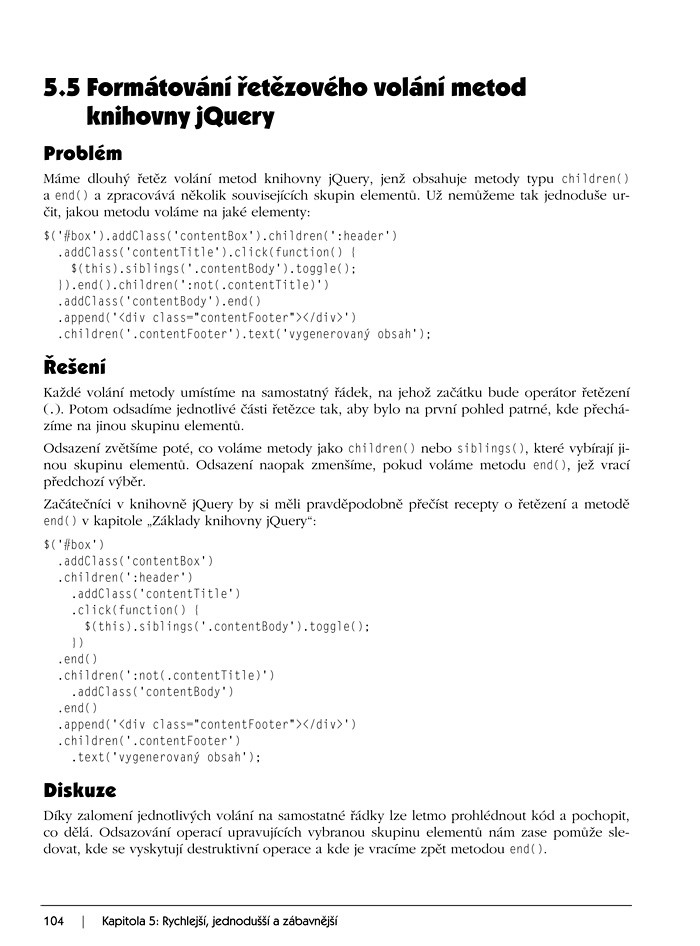 Zkušení autoři, kteří se přímo či nepřímo podílejí na vývoji knihovny jQuery, vás nejdříve seznámí se základy knihovny jQuery a poté vás postupně provedou řešeními problémů ze všech oblastí běžných při vývoji moderních webových stránek. Ke každému řešení je připojena diskuze nabízející hlubší vhled do dané problematiky a případné alternativní možnosti řešení. Jednotlivé problémy jsou přehledně členěny do tematických sekcí, díky čemuž bude nalezení požadovaného řešení dílem okamžiku. Publikace vás mimo jiné naučí, jak: