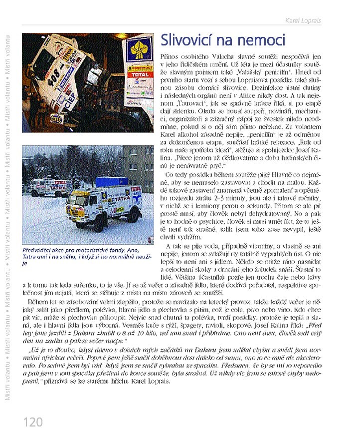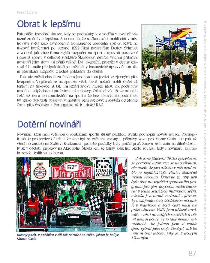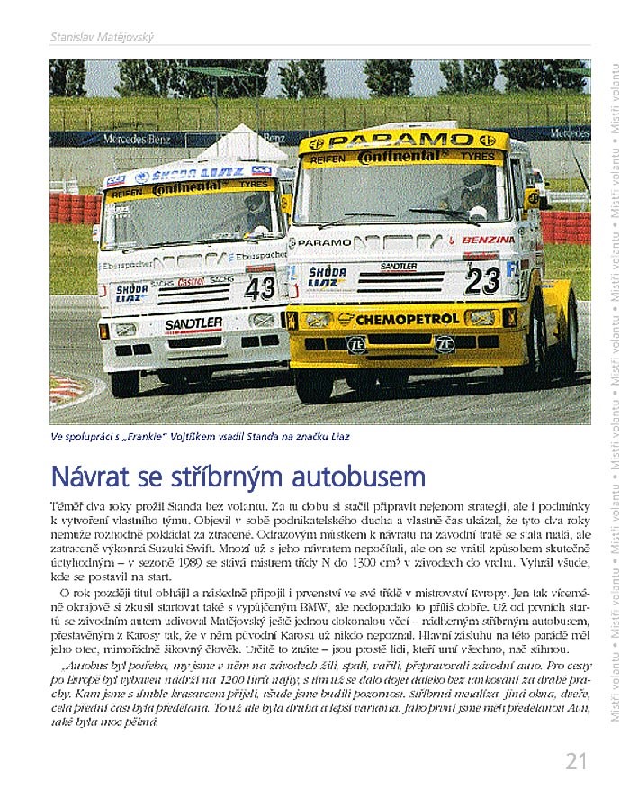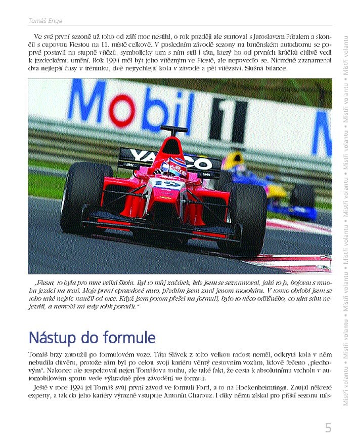 Celobarevná kniha popisuje začátek a průběh kariéry jedenácti nejlepších českých automobilových závodníků z poslední doby. Najdete v ní poutavě napsané životopisy Romana Kresty, Pavla Sibery, Emila Trinera, Otakara Krámského, Josefa Michla, Jiřího Mičánka, Josefa Kopeckého, Jaroslava Hoška, Stanislava Matějovského, Karla Lopraise a Tomáše Engeho.