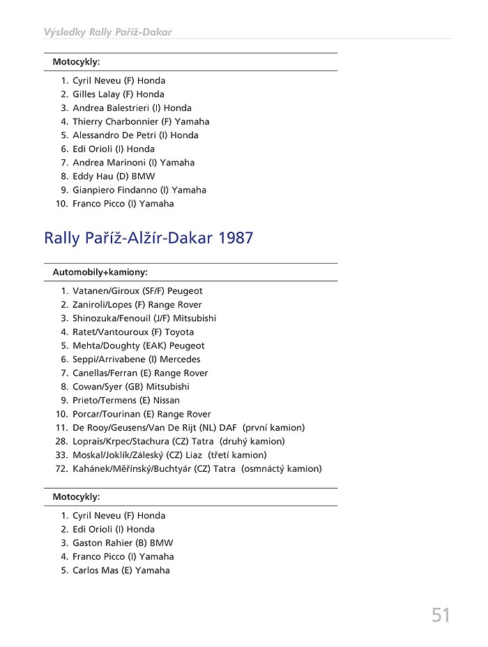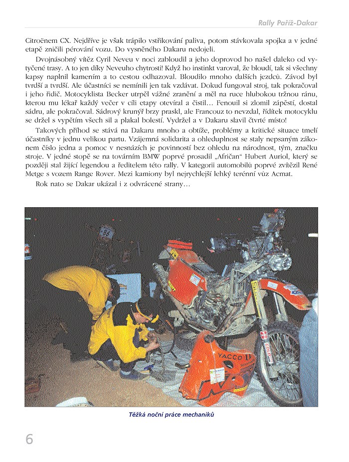 O „Dakaru“ již toho bylo napsáno hodně. Ale kompletní historie tohoto slavného pouštního maratonu od jeho počátku až do současnosti včetně podrobných výsledkových listin, fotografií jezdců a zážitků vítězů…to v jiné knize nenajdete.