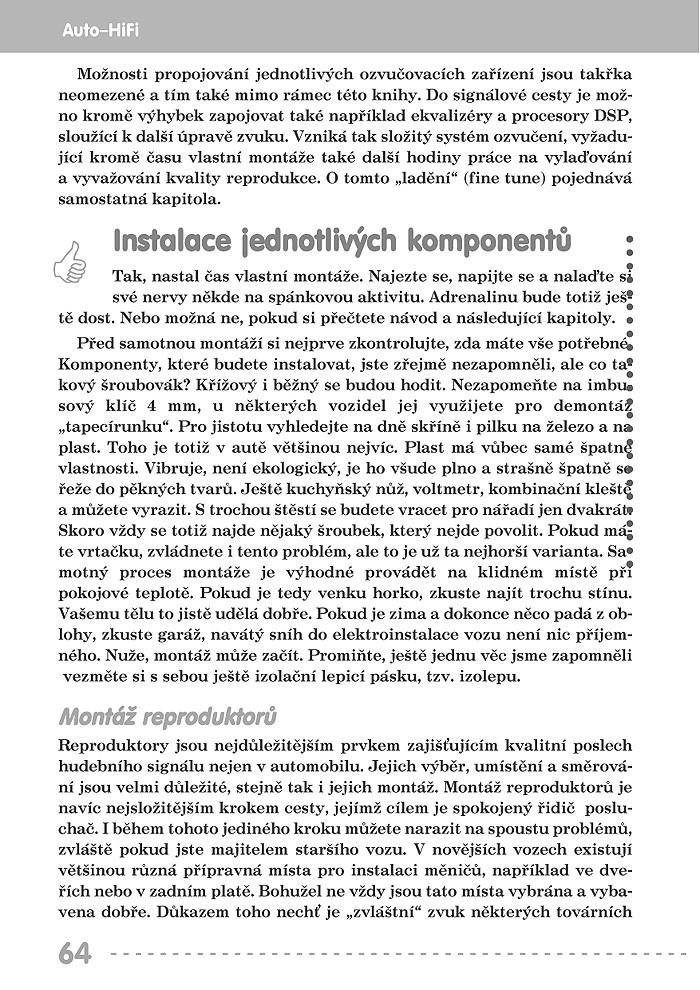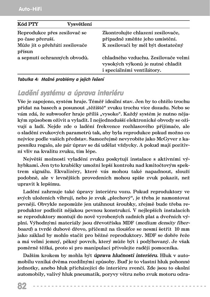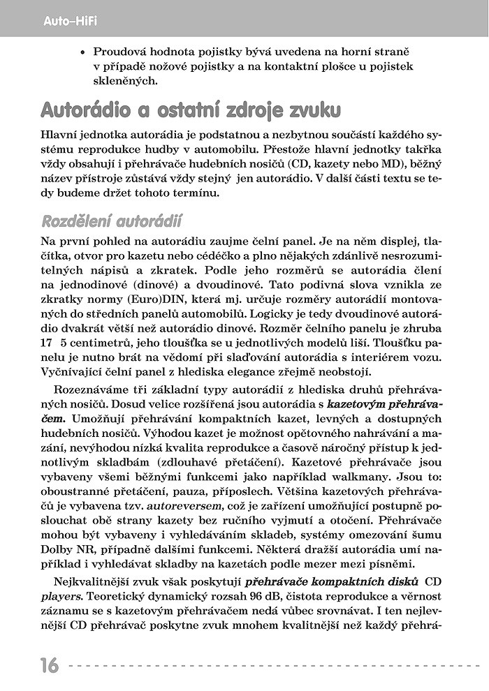 Jediná kniha na trhu, věnující se oblasti audiotechniky a hifi systémů v osobních automobilech, určená pro běžné řidiče i majitele tuningově upravených vozidel. Nevíte, jaký systém si máte vybrat, v čem se rádia, reproduktory, CD měniče a přehrávače od sebe odlišují, co je z mnoha udávaných parametrů důležité pro kvalitní poslech, jak vše zapojit a nainstalovat, jak odhlučnit auto a zlepšit vnitřní akustiku, případně jak odstranit elektromagnetické rušení nebo různé závady rádia, CD přehrávačů či reproduktorů? To vše se dozvíte z naší knihy.