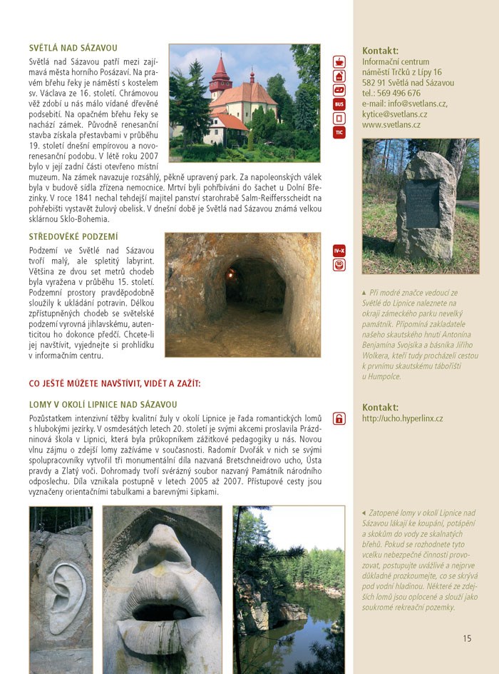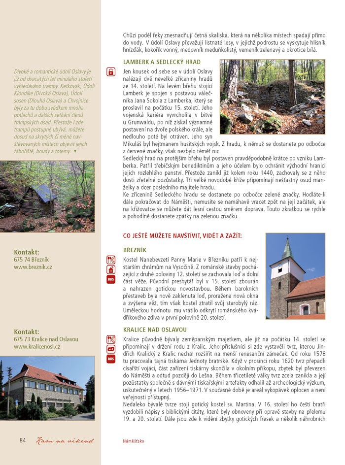 Díky přehledným ikonkám se dozvíte, je-li vybraná pamětihodnost, muzeum, přírodní zajímavost atp. dostupná ve všech ročních obdobích, vhodná pro děti a také jak je návštěva náročná finančně. Pro ty, které nezaujme některá z aktivit uvedených v hlavní části textu, jsou vybrány alternativní tipy ve stejné lokalitě. V knize nechybí barevné fotografie a mapy.