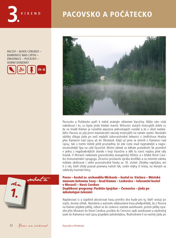 Tituly z edice Kam na víkend navazují na úspěšnou řadu Kam v České republice. Jejich prostřednictvím chceme čtenářům nabídnout vždy několik tipů na víkend v dané oblasti. Každý víkend obsahuje návrh na strávení příjemného dne tak, aby jednotlivé destinace byly snadno dosažitelné. Pokud jste se rozhodli pro prodloužený víkend, najdete v knize i nabídku na prožití třetího dne.