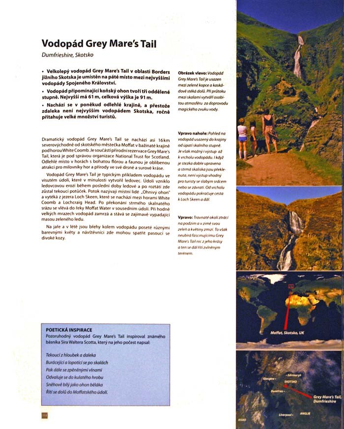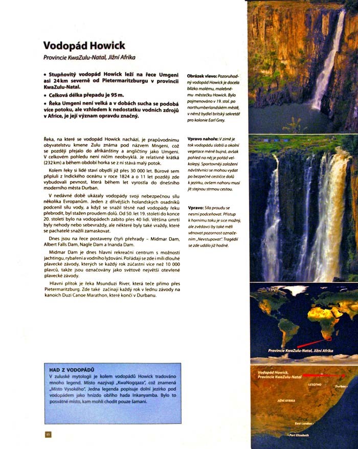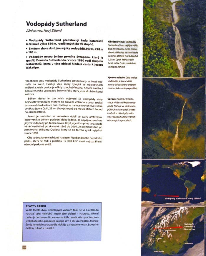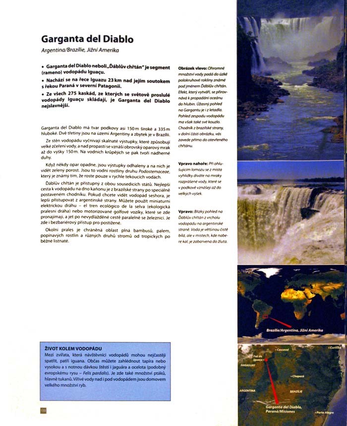 Doprovodný text shrnuje fascinující geologická fakta, rozměry vodopádů a jejich vodních toků. Uvádí také, kdy a jak byly objeveny a jak byly v historii spjaty s lidskou činností.