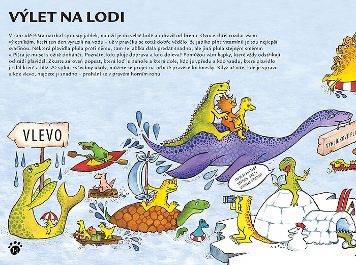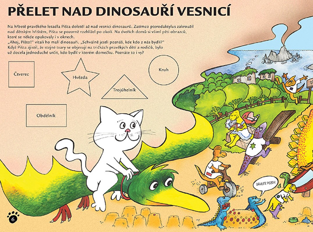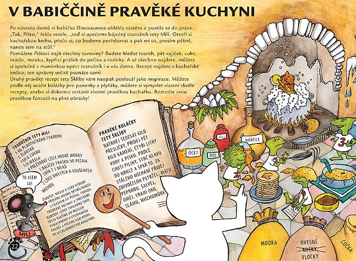 Pokud se společně s kocourem Pištou a jeho kočičím kamarádem vypravíte do pravěku, nečeká na vás jen zajímavý příběh, ale také spousta úkolů, záhad, her a hlavolamů. Kniha je určena především pro čtenáře od pěti do devíti let; menší děti budou potřebovat pomoc rodičů, starší si v ní už mohou číst a řešit úkoly samy. Hledání správných řešení učí děti logickému a kombinačnímu myšlení a rozvíjí jejich pozornost, postřeh a tvůrčí schopnosti. Jednotlivé úkoly se soustředí především na základní dovednosti, zaměřené na rozvoj smyslového vnímání, myšlení a řeči – rozeznávání barev, rozlišení a pojmenování základních geometrických tvarů, procvičování jednoduchých počtů, orientaci v prostoru, rozvíjení slovní zásoby anebo třídění předmětů podle stejných vlastností. Můžete si ovšem zahrát i jednoduchou hru anebo vyzkoušet zajímavý kuchařský recept pro mlsné děti a odvážné rodiče, při němž si děti procvičí jemnou motoriku a rodiče míru trpělivosti. Ať už hledáte zábavu nebo poučení, tahle knížka vám nabízí obojí v dostatečné míře. Neváhejte a vydejte se spolu s Pištou za pravěkým dobrodružstvím!