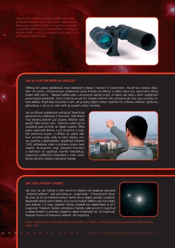Cestovat s dalekohledem mezi hvězdami je stejné, jako cestovat po exotických krajinách naší planety. Jistě, člověk se může dívat na televizní seriály, ve kterých se předvádí krásy jednotlivých světadílů. Může si také kupovat turistické časopisy a putovat s nimi prstem na mapě. Pokud se ale nevydáte na skutečnou cestu, okořeněnou suchým prachem, nemilosrdným větrem a romantickým Sluncem, nikdy nepochopíte, jak pozoruhodný a krásný může být svět kolem vás. Totéž platí při procházkách noční oblohou. Můžete si o vzdálených kosmických tělesech číst. Můžete sledovat přírodopisné filmy, které se vám snaží přiblížit vesmír až do vašeho domova. Ale pokud nevezmete do ruky lovecký triedr a nevydáte se na cestu mezi hvězdy, nevíte, o co přicházíte. Proto neváhejte a cestujte.