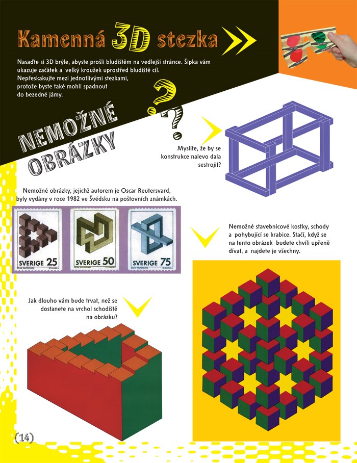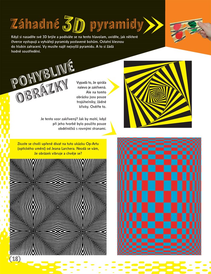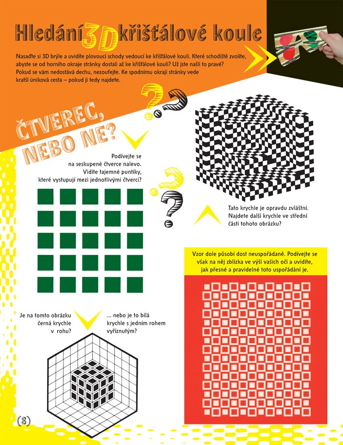 Nahlédněte s námi do světa optických hlavolamů, hříček, iluzí a triků, do světa neskutečných obrázků, které vám přímo vyskočí ze stránky. Jakmile si nasadíte 3D brýle, které najdete v knize, opustíte obyčejnou stránku a rozšíříte si ji o třetí rozměr. Díky tomu budete moct v knize vnímat možné i nemožné obrázky a řešit hlavolamy, se kterými jste se doposud nesetkali.