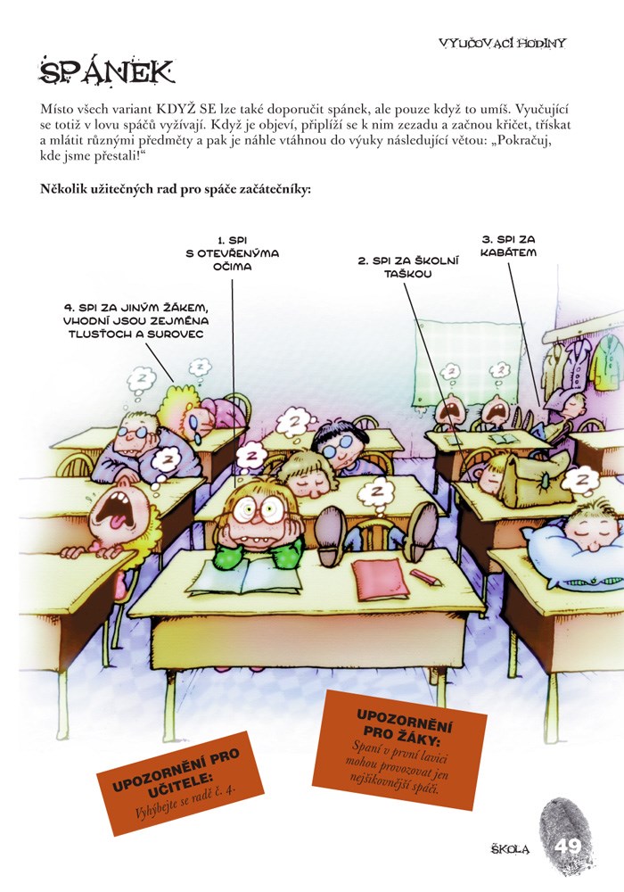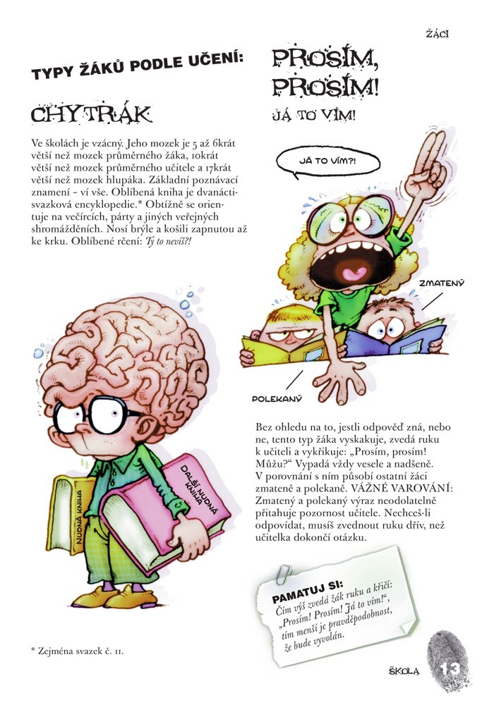 Chcete-li ve zdraví prožít školní léta, kupte si tuto příručku pro přežití školní docházky. Uvidíte, že vaše škola není v ničem výjimečná. Stejné problémy řeší ve školních lavicích každý z nás. Dozvíte se vše o typech učitelů, jak se nejlépe omlouvat při pozdním příchodu, co dělat při setkání se školníkem, jak přežít exkurzi nebo školní výlet a mnoho dalších důležitých rad. Vše je okořeněno humorem a vtipnými ilustracemi. Knihu určitě ocení i vaši spolužáci, až si ji budete číst ve vyučování pod lavicí. Jen dejte dobrý pozor, učitelka číhá za každým rohem!