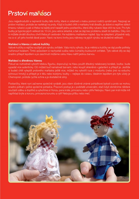 - V knize naleznete celkem 15 tipů na výrobu konkrétní louky, od nejjednoduššího prstového či dlaňového maňáska přes stínovou loutku až po složitou marionetu, kdy je podrobný návod výroby vždy doplněn o názorné barevné fotografi e. Nechybí ani postup na sestavení malého loutkového divadla.