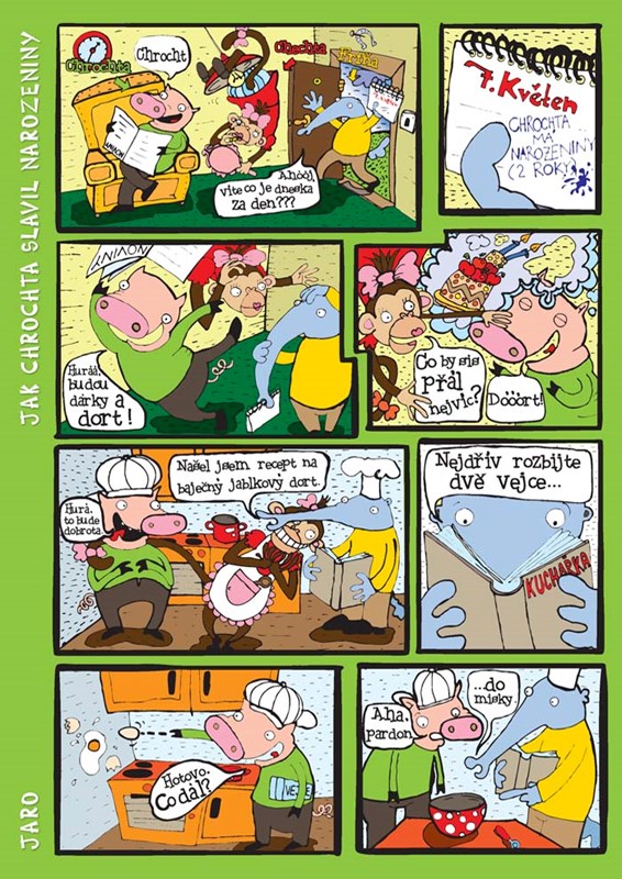 Jednotlivé recepty jsou navíc rozděleny do čtyř kapitol dle ročních období, takže se nemusíte bát, že by vám s naší knihou v průběhu roku došly nápady. Každá z kapitol je pak uvedena vtipným dvoustránkovým komiksem, v němž se seznámíte s opičkou Chechtičkou, prasátkem Chrochtou a mravenečníkem Frfňou. Tito tři zvířecí kamarádi vám pak budou při vaření radit, jak na to a při přípravě každého z receptů vám přispěchají na pomoc s dobrou radou.