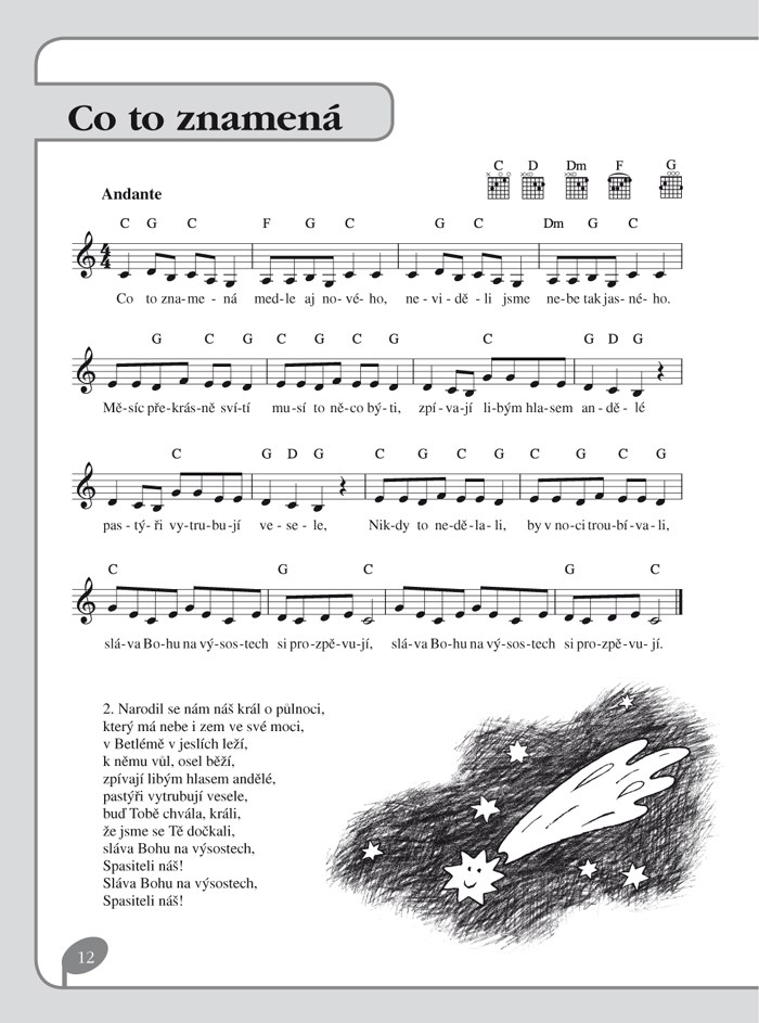 Zpěvník obsahuje výběr nejznámějších českých koled, ale i koledy anglické. Každá z nich je uvedena ve dvou tóninách – tak aby vyhovovala hlasovému rozsahu dětí i aby šla snadno zahrát na klavír, flétnu, housle či kytaru. Součástí not jsou písmeny vypsané akordy i kytarové akordové značky.