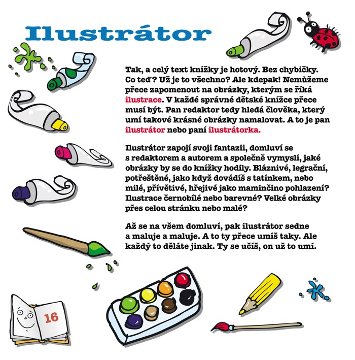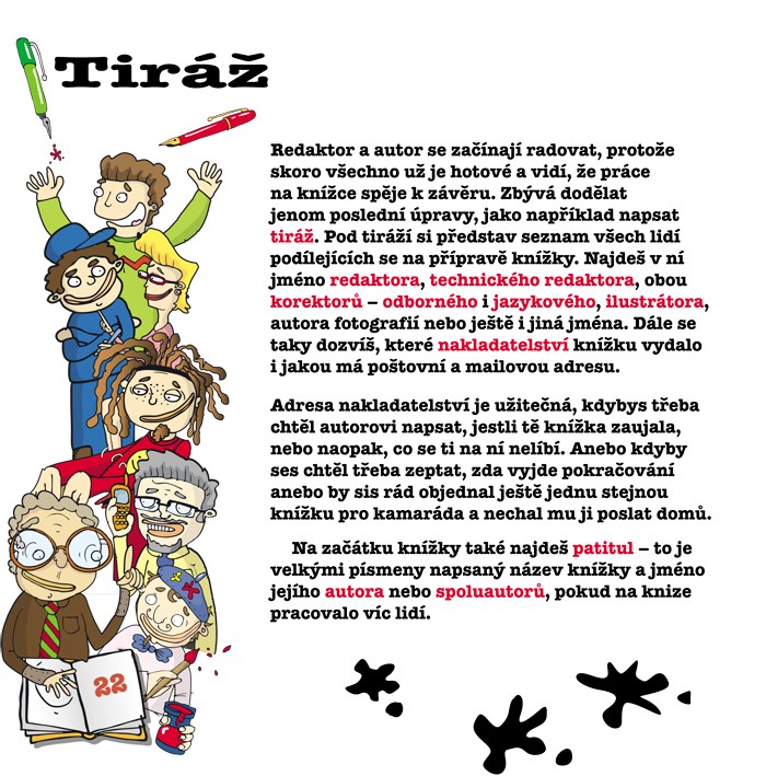 Stačí mě jen otevřít a já vám na svých stránkách prozradím, jak se stane, že se v hlavě pana spisovatele začne klubat nápad na novou knížku a co je při tom úkolem pana redaktora nebo sazeče. Se mnou se také dozvíte, jak je pro nás důležitý pan ilustrátor, kdo je to odborný a jazykový korektor, a seznámím vás navíc ještě i s panem produkčním. Pak se spolu podíváme do tiskárny a nakonec navštívíme knihkupectví.