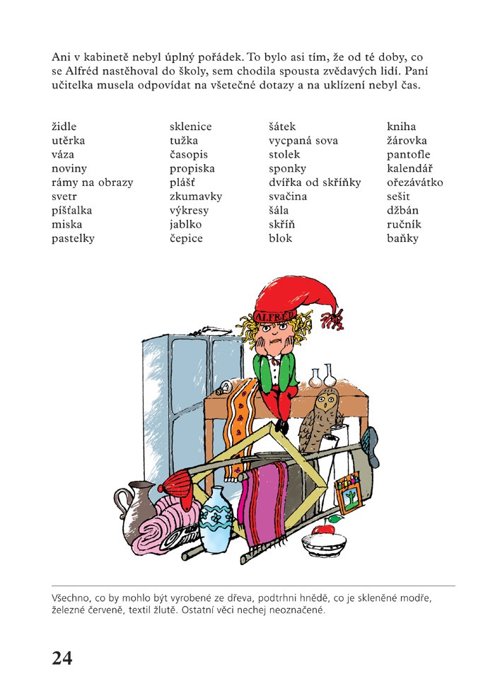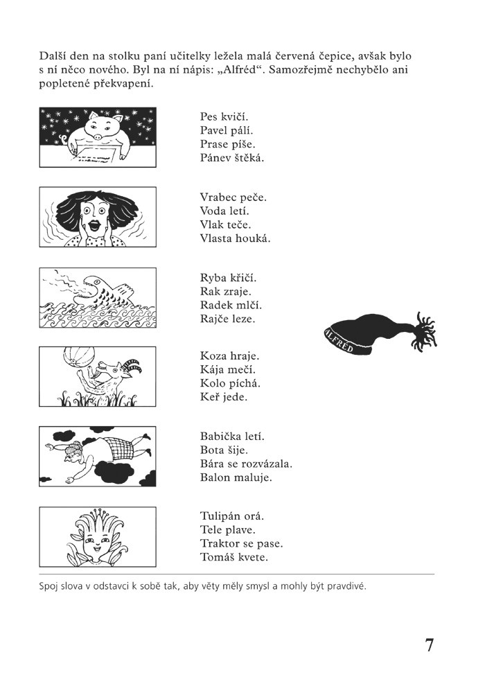 Začněme tedy od autorky Jiřiny Bednářové a ilustrátora, malíře Richarda Šmardy. Po dříve vydaných knihách zaměřených na dětskou kresbu a psaní nyní spojili své tvůrčí síly v knize věnované rozvoji čtení. Autorka dokáže svým vtipným textem zaujmout malé čtenáře tak, že rádi napravují, spolu s žáčky naschválovské školy, zmatky napáchané skřítkem Alfrédem, který se v Naschválově usadil. Je to ale skřítek docela milý, vede totiž nenásilně malé čtenáře ke hře s mateřským jazykem za pomoci lákavých obrázků malíře, který rozumí dětem, vtipných úkolů a rébusů. A tak se postupně malý čtenář, občas s podporou blízkého dospělého, seznamuje se smyslem slov, vět a celého textu. Rozvíjí se tak jeho zrakové i sluchové vnímání a samozřejmě také logické uvažování, když opravuje skřítkem popletené věty a konečně i delší texty. Autorka, poradenský pedagog s dlouholetou praxí v podpoře dětí s výukovými obtížemi, vede malého čtenáře v promyšlených a metodicky výborně zvládnutých krocích k radosti z hry se slovy, k pochopení textu. Kniha je uspořádána tak, že dítě bude dychtivě očekávat, copak ještě skřítek Alfréd provede, jaké žertíky dětem i dospělým připraví. My dospělí vidíme, že dítě je k plnění úkolů motivováno, je stále znovu povzbuzována jeho zvídavost, pracuje s radostí, nemusíme je ke čtení nutit.