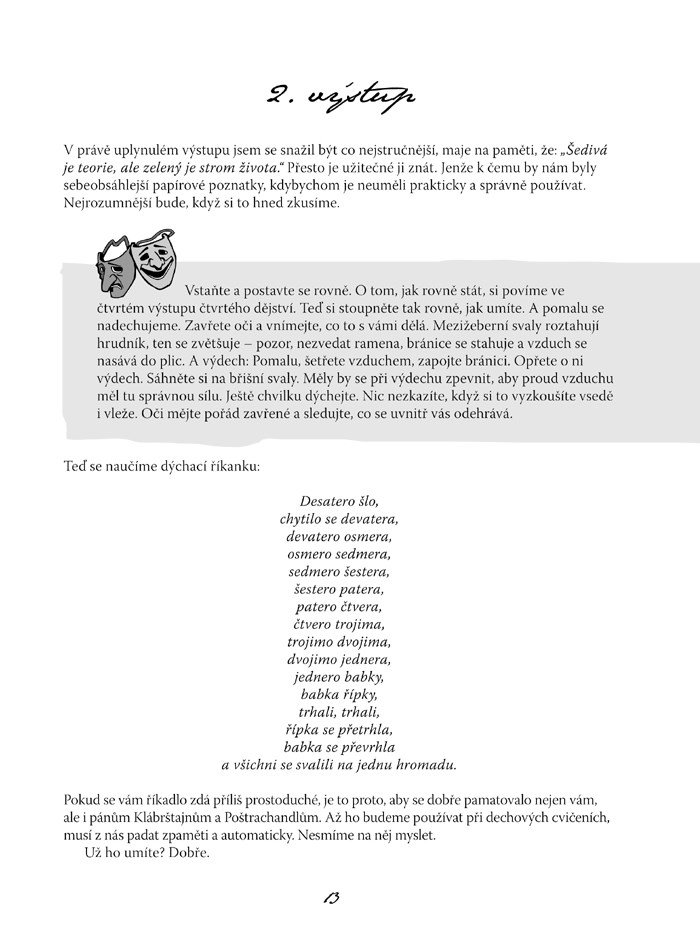 Přesto pro vás bude naše hamletovská výchova užitečná. Nejen že poodhalí oponu oboru, který vám byl možná dosud neznámý, ale naučí vás i mnoha praktickým dovednostem. Pomůže vám ke správnému držení těla, rovné a uvolněné chůzi, ukáže vám na mnoha příkladech správnou výslovnost, dá vám návod, jak dobře dýchat, sebevědomě vystupovat a srozumitelně vyjádřit své názory a požadavky. Vyznáte-li se v rytmu řeči, důraznosti, nebo naopak zaoblenosti gesta, můžete lépe pochopit byť i nevyslovené myšlenky partnera, s nímž máte tu čest. Nehledě k tomu, že se lépe jedná s člověkem, který ví co chce, a umí to jasně vyjádřit. Jednoduše – naučíte se lépe poslouchat a odpovídat. A to není málo.
