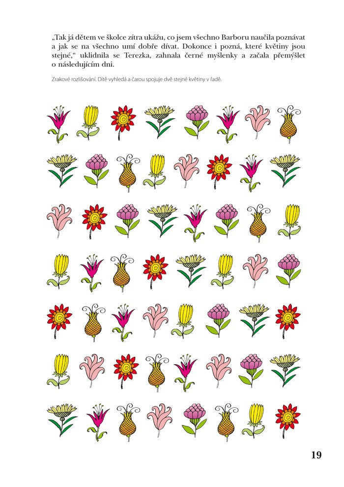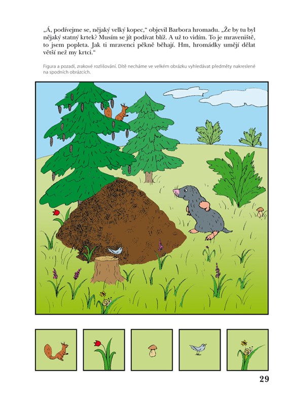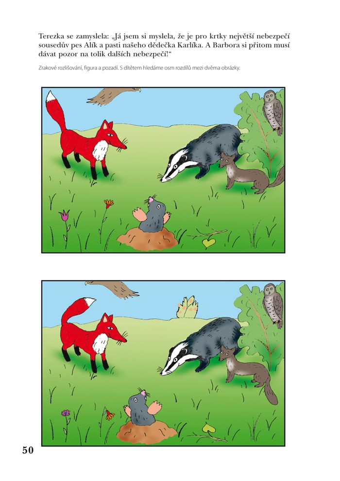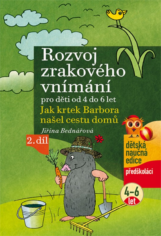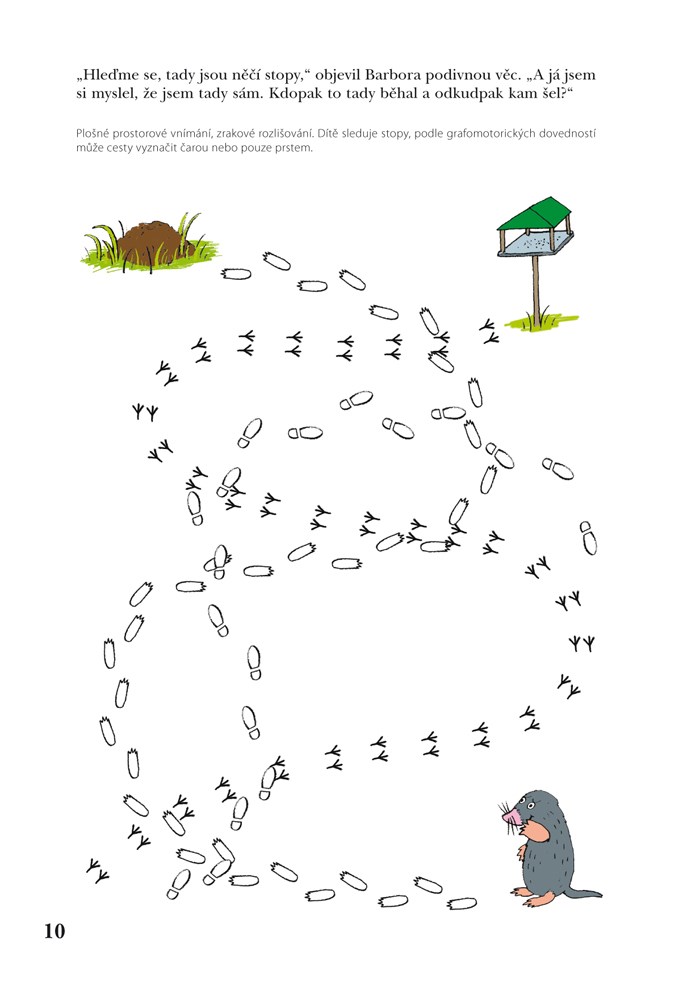 Když Ondra odešel, pustila jsem se do čtení já. Zjistila jsem, že příběh krtka Barbory je přitažlivý, podporuje zvídavost dětí a motivuje je k plnění úkolů. Stejně jako v prvním díle jsou úkoly zaměřeny na všechny oblasti zrakového vnímání. Jsou však obtížnější, je potřeba rozlišit jemnější rozdíly, drobné detaily. Dítě bude pastelkou označovat správné řešení, spojovat shodné tvary, skládat rozstříhané obrázky. Opět však autorka metodicky postupuje od jednoduššího k složitějšímu, a tak podporuje dítě v rozvíjení zrakového vnímání, které už brzy využije při čtení a psaní.