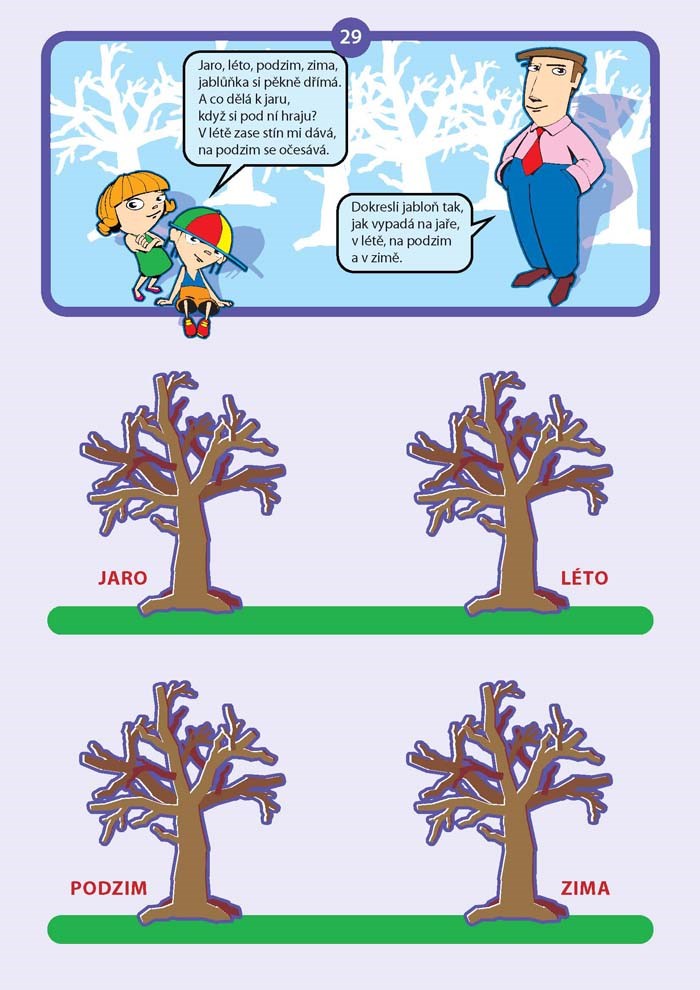 Obsahuje grafomotorická cvičení, která učí jemné pohyblivosti ruky, důležité pro základ psaní v první třídě, a vede dítě rovněž k orientaci v čase a prostoru. Jednoduché matematické úlohy rozvíjí schopnost určovat počet a porovnávat velikosti. Rovněž je kladen důraz na postřeh, rozlišení tvarů i barev. V pracovních listech jsou použity pojmy z běžného života, aby dítě mohlo pracovat se známými slovy a obrázky. Hravou formou je zde spojen pohyb s říkankou, což je velmi důležité pro lepší a trvalejší upevnění získávaných schopností a dovedností.