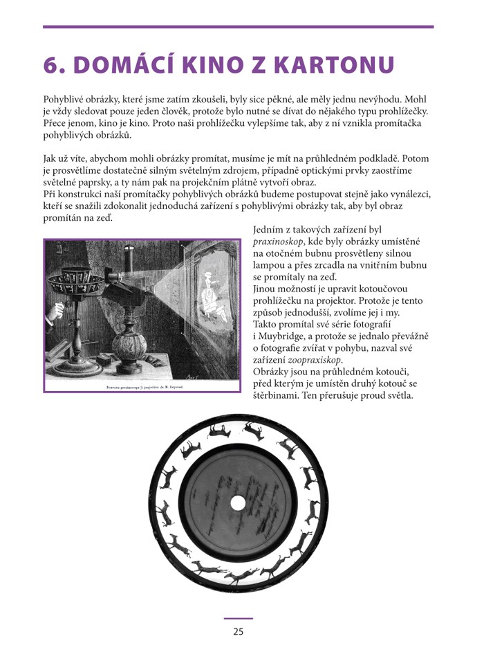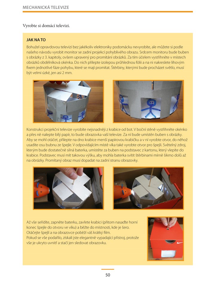 Autor pro svůj výklad principů funkce mnoha složitých zobrazovacích přístrojů zvolil velmi zajímavý přístup. Spojení dětské hravosti s hi-tech přístroji působí nadmíru přitažlivě. Zvídavý čtenář s údivem zjistí, že k pochopení a ověření principů funkce řady složitých systémů, jako jsou snímací kamery, filmové projektory, DLP projektory a televize, stačí jen velmi málo. Žádné složité vztahy a schémata. Autor po čtenáři požaduje: lepenku, papírovou krabici, špejle, připínáčky, lepidlo, ubrousek, baterku a pak už jen trochu trpělivosti a pečlivosti. Odměnou mu pak bude krásný pocit z vlastního animovaného „filmu“ a jeho promítání ve vlastním lepenkovém kině nebo dobrý pocit při prohlížení obrázků statického DLP projektoru. A nejen to, současně se dozví mnoho zajímavých detailů jak o těchto přístrojích, tak i o lidech, kteří je vymysleli. RNDr. Vladimír Chlup