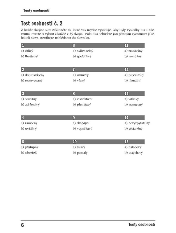 Kniha Testy osobnosti vám pomůže stanovit osobnostní profil u sebe sama nebo u osoby, do jejíhož nitra byste rádi nahlédli hlouběji. Skládá se ze sady 38 osobnostních dotazníků, pomocí nichž např. zjistíte, jak silná osobnost jste, kam inklinuje váš temperament, jak si věříte, jak umíte jednat, zda inklinujete k riziku nebo jistotě, jaký máte smysl pro spravedlnost, jestli jste vůdčí typ, jaké jsou vaše tvůrčí schopnosti, nakolik jste agresivní, poctiví, šetrní, odvážní, dominantní, úzkostliví, družní, citově založení, ambiciózní, tolerantní, asertivní atd.
