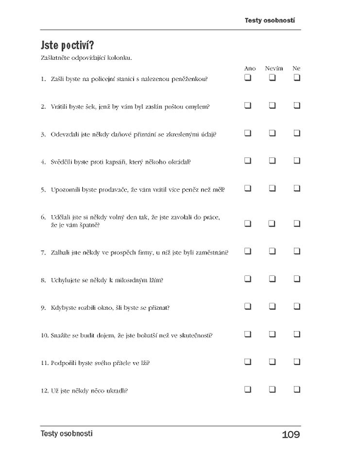 Titul v první objemnější kapitole obsahuje 40 osobnostních testů s bodovým vyhodnocením. Jestliže čtenář testy vyplní a sečte body, zjistí, jaké má psychické dispozice nebo jakého je povahového zaměření (např. nakolik jste dominantní, diplomatičtí, ambiciózní, agresivní, tvůrčí atd.) Druhá kapitola obsahuje 2 sady testů inteligenčních (prostorovou představivost, logiku verbální schopnosti a počtářské schopnosti).