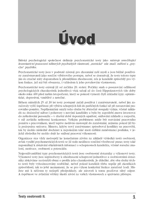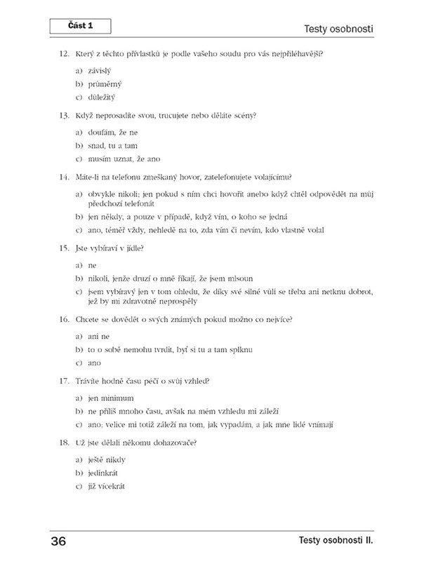 Kniha Testy osobnosti II. vám pomůže stanovit osobnostní profil u sebe sama nebo u osoby, do jejíhož nitra byste rádi nahlédli hlouběji. Skládá se z nové sady 42 osobnostních dotazníků a výkonových testů, pomocí nichž např. zjistíte, jak silná osobnost jste, kam inklinuje váš temperament, jak si věříte, jak umíte jednat, zda inklinujete k riziku nebo jistotě, jaký máte smysl pro spravedlnost, jestli jste vůdčí typ, jaké jsou vaše tvůrčí schopnosti, nakolik jste agresivní, poctiví, šetrní, odvážní, dominantní, úzkostliví, družní, citově založení, ambiciózní, tolerantní, asertivní atd.