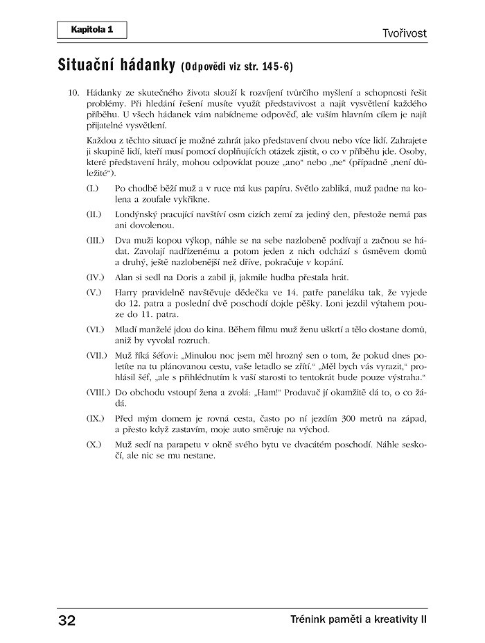 Tato cvičení vám mohou mnohdy připadat triviální, ale cokoli procvičuje váš mozek odlišným a novým způsobem, může mít pozitivní vliv na aktivizaci vašich mozkových buněk. I kdybyste si testy a hádanky uvedené v knize prozatím pouze prolistovali, už tím byste poskytli svému mozku důkladné procvičení a přinejmenším si vytvořili základy, na nichž už je možné stavět.