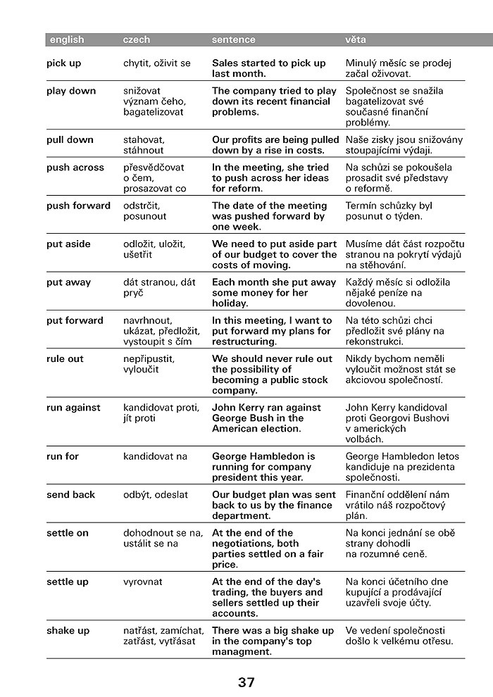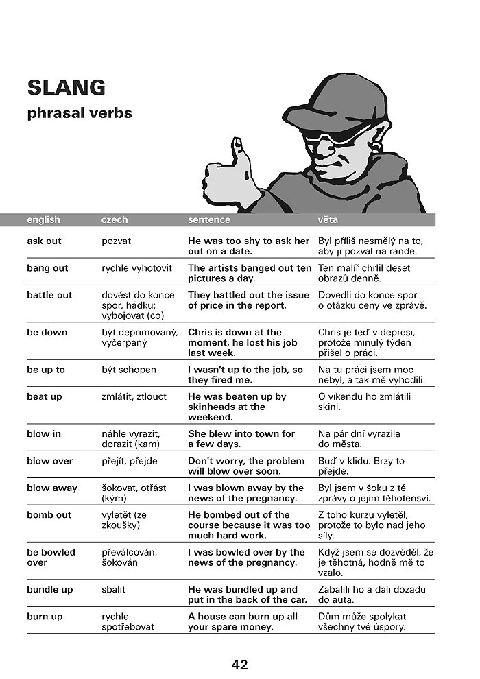 Anglická frázová slovesa jsou v knize rozdělena do kapitol Essential, Frequent, Advanced, Business, Slang, v rámci každé z kapitol jsou pak řazena abecedně. Za každým slovesem je uveden český překlad a následuje věta. Uvědomíte si tak vazby a kontext, jak bývá dané frázové sloveso nejčastěji užíváno.