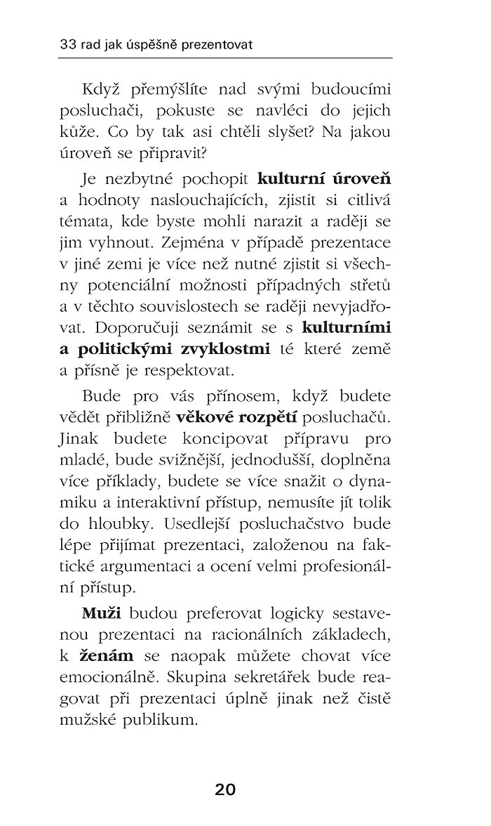 Přesvědčivě provedená prezentace je jádrem úspěšného obchodu. Mini příručka vám nabídne rady a tipy jak co nejefektivněji prezentovat výrobky i služby. Seznámí vás s tím, jak si prezentaci připravit, abyste na nic podstatného nezapomněli, jak ji zahájit, abyste upoutali pozornost i jak odpovídat na námitky těch, kteří pochybují, jak je přesvědčit, abyste následně co nejvíce prodali.