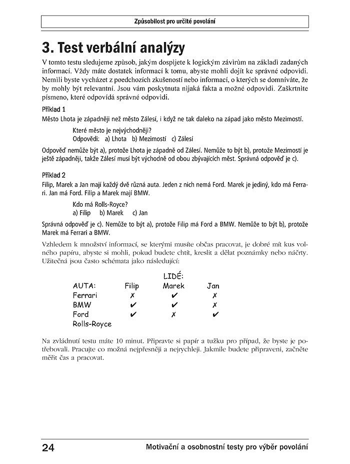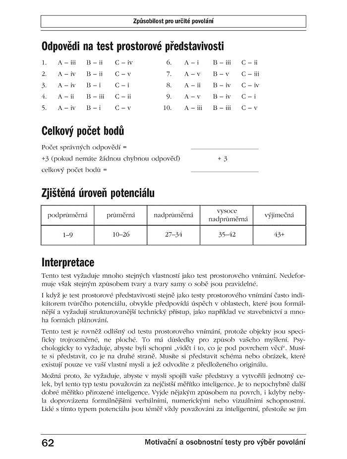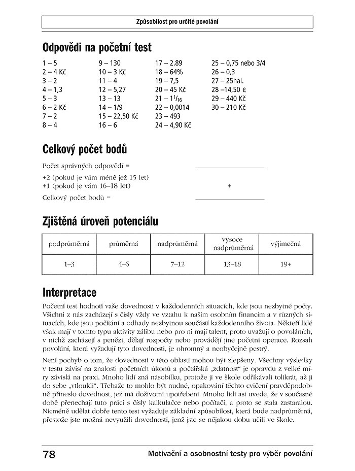 Na konci každé kapitoly je klíč a návod k vyhodnocení úspěšnosti. U každého typu testu najdete návod, jakým způsobem k jeho řešení přistupovat. V databázi profesí, která je součástí knihy, naleznete podrobný seznam profesí a charakteristiky, jež by měl splňovat vhodný zájemce o daný druh profese.