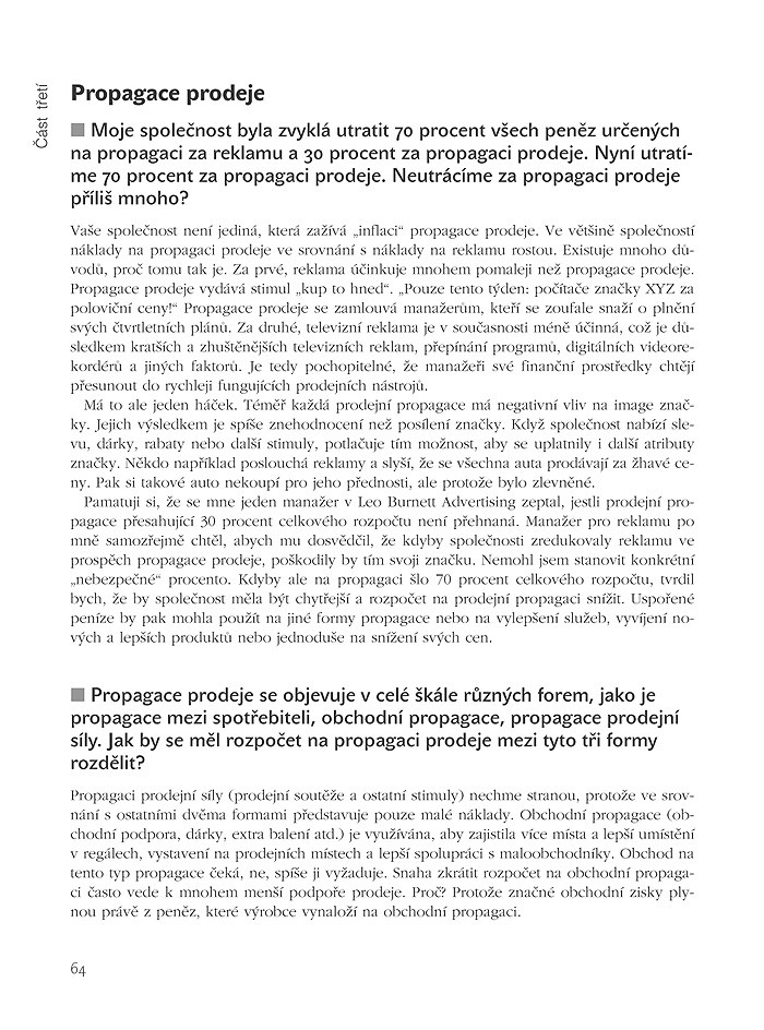 Následují odpovědi na otázky z mnoha oblastí, ve kterých se dá marketing použít (spotřební zboží, maloobchodní marketing, marketing malých podniků, přímý marketing, internetový marketing, mezinárodní marketing, marketing v období recese, politický marketing a marketing se sociální zodpovědností). Pomyslnou třešničkou na dortu budou komentáře o dokonalém marketingu, jak ho praktikují ty nejlepší společnosti.