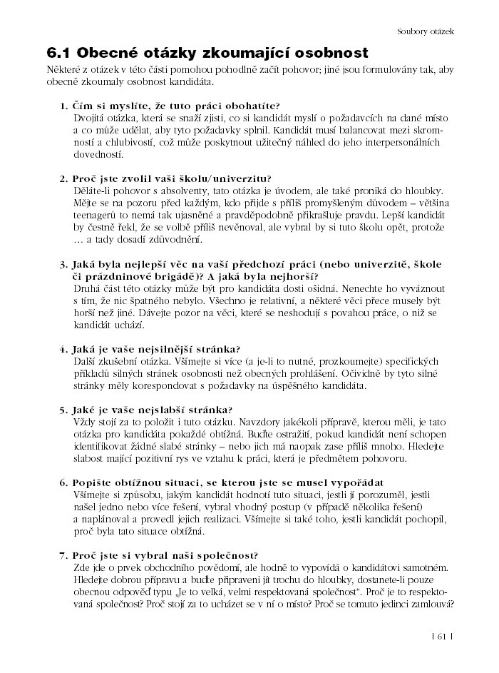 Kniha rovněž obsahuje sérii „šokových“ otázek na důkladné prověření kandidátových silných stránek.