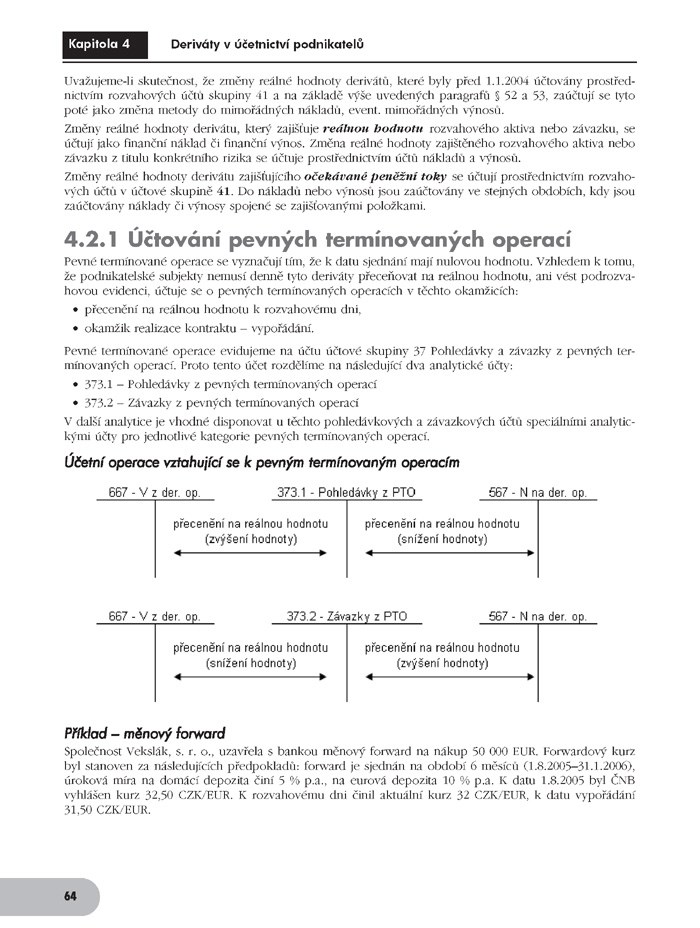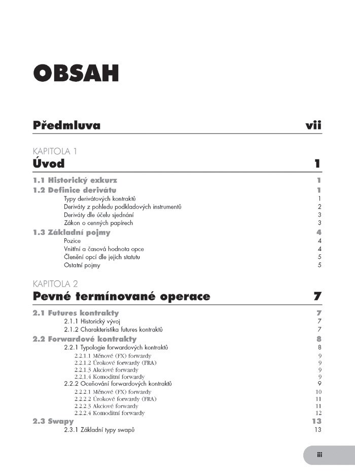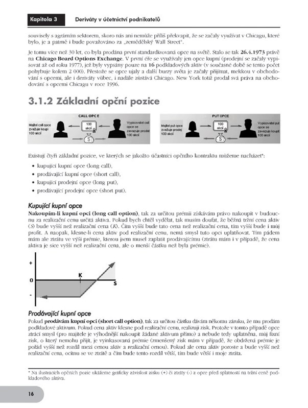 Praktická příručka se věnuje problematice derivátů z hlediska podnikových financí. Zabývá se jejich ekonomickými a účetními aspekty, zmiňuje problematiku úpravy derivátů jak v rámci českých účetních předpisů, tak v rámci Mezinárodních standardů finančního reportingu (IFRSs). Čtenář zde najde užitečnou informaci o pevných termínových kontraktech a o způsobech jejich oceňování. Nemalý prostor je věnován opcím, jejich vlastnostem, typologii. Také je uvedena přehledová informace o některých exotických derivátech. Výklad doplňují základní schémata účtování derivátových transakcí, důležité vzorce a praktické příklady.