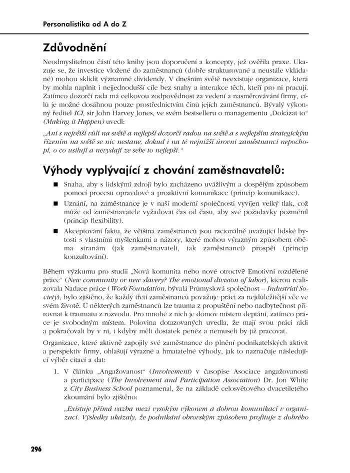 Předkládaná publikace pomáhá zaměstnavatelům porozumět zaměstnaneckým vztahům. Za posledních 40 let totiž vznikl obrovský posun od vztahu „pán-sluha“ k přístupu, který lze přirovnat k partnerství. Ti, kteří vnímají „partnerství“ jako příliš silný výraz, by si měli položit otázku, zda „lze něčeho v mé firmě dosáhnout bez zaměstnanců?“.