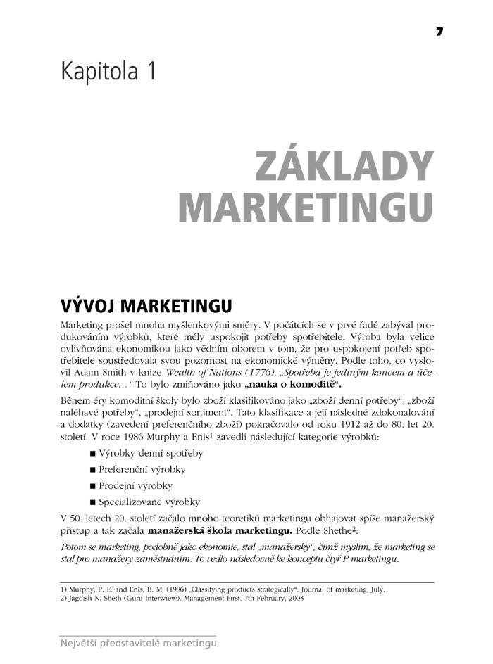 Publikace vám nabídne následující slavná jména: Peter Drucker, Theodore Levitt, Philip Kotler, Michael Porter, Igor Ansoff, Tom Peters, Georgie Day, Jagdish Sheth, Thomas Nagle. Seznámí vás stručně s životopisy, ale především s jejich hlavními myšlenkami a stěžejními publikacemi. Dozvíte se, jakou roli každý z nich v marketingu sehrál a jaký byl jeho největší přínos.
