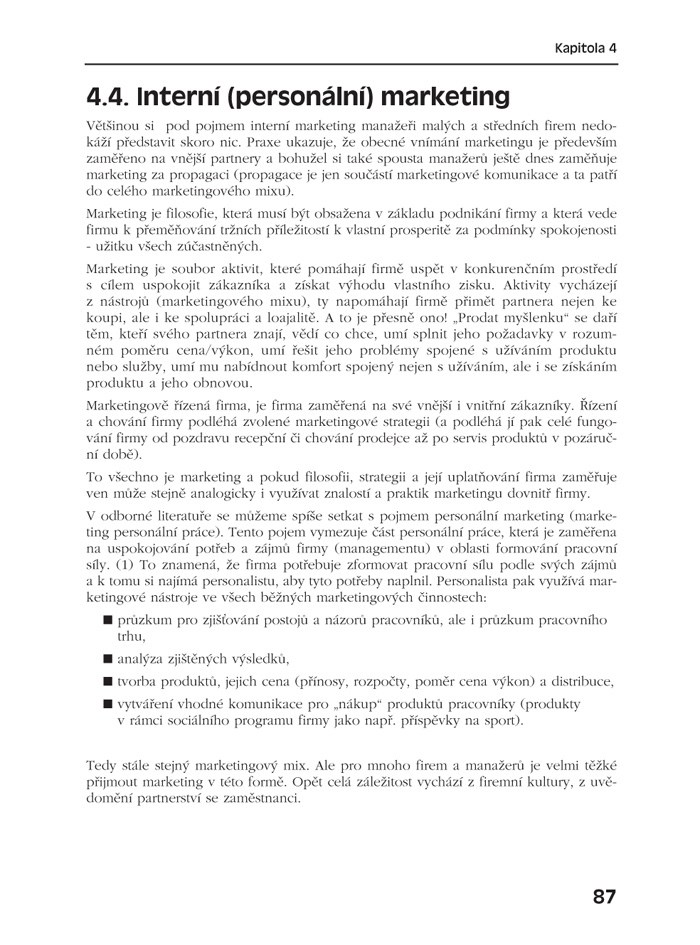 Publikace Interní komunikace ve firmě má sedm kapitol. Po stručném úvodu se zabývá nejdůležitějšími otázkami komunikace ve firmě. Jde o vymezení pojmu komunikace ve firmě se zaměřením na interní komunikaci, hlavní cíle interní komunikace, její formy a metody. Stručně se teoretická a výkladová část uzavírá hodnocením efektivity uvnitř firmy. Stejný význam jako mají uvedené kapitoly má i kapitola uvádějící případovou studii k nastavení interní komunikace a přílohy. Jde o průzkum, jeho výsledky, návrh a doporučení, přílohy představuje dotazník, příkaz pracovního modelu, nástupního plánu, příklad rozhovoru a závěrečného testu. V publikaci je uvedeno seznam použité a doporučené literatury a seznam použitých zkratek.