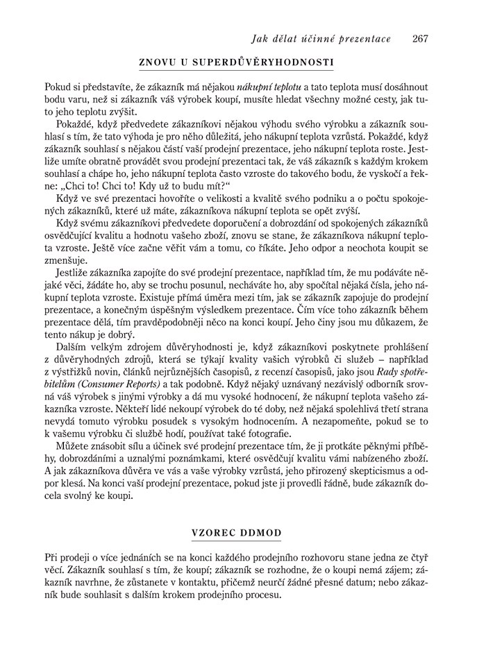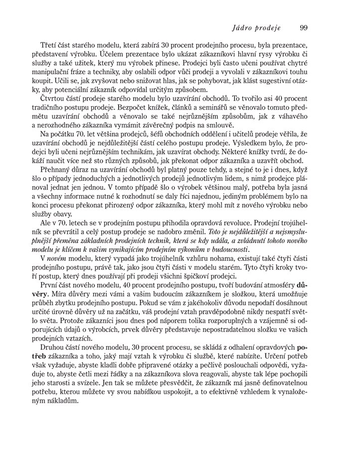 Podstatný rozdíl mezi touto knihou a „návody“ na prodejní úspěch spočívá v tom, že se vyhýbá klišé, pěkně znějícím větám a argumentům, které se snadno řeknou, ale hůř provedou. Zatímco po přečtení jiných knih tohoto zaměření budete možná chytřejší, po prostudování Tracyho budete úspěšnější.