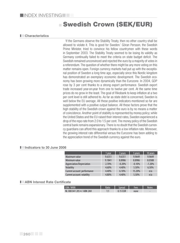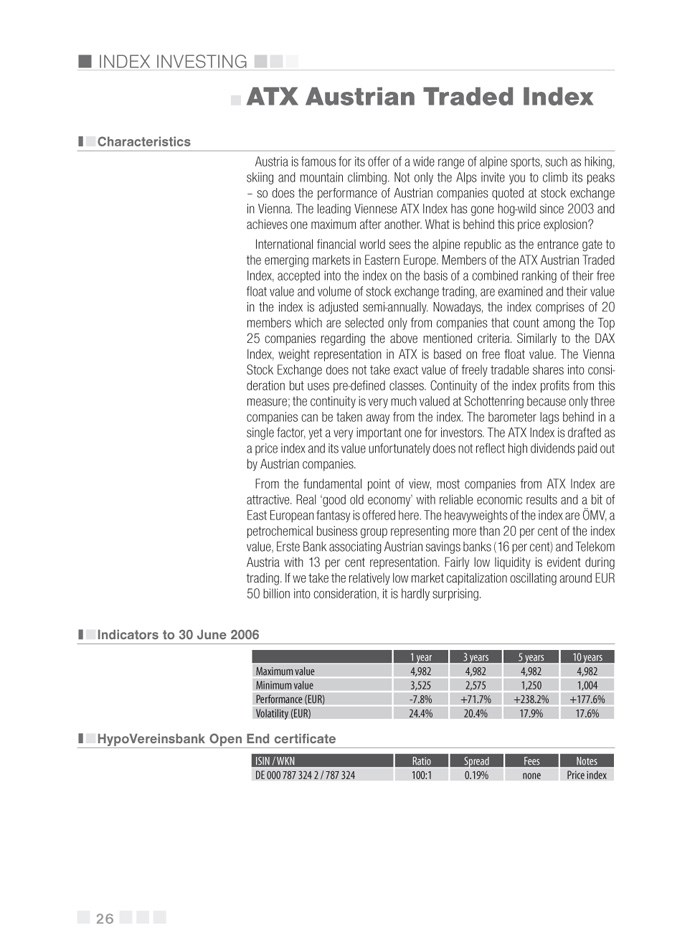 Besides the widely known indices, the reader will have the opportunity to realize what lies behind such “exotic” market barometers as, e.g. “AMEX Gold Bugs” or “NIFTY 50, along with obtaining crucial information about the best certificates available.