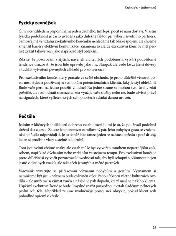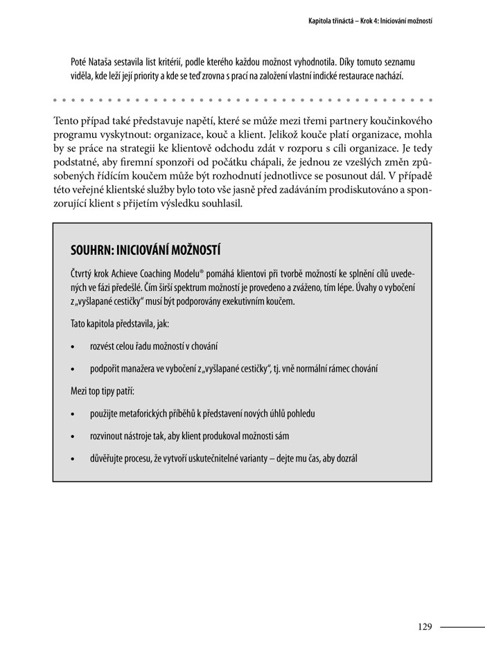 Ať patříte mezi trenéry nebo manažery, příručka o koučování vám pomůže rozvíjet skryté dispozice pracovníků ve vašem týmu. Ukáže vám, jak pracovat sám na sobě, abyste získal(a) dovednosti dobrého kouče: uměl(a) vybudovat vzájemnou důvěru, pozorně naslouchal(a) správně se ptal(a), měl(a) intuici, chytře stanovoval(a) úkoly ad. Umožní vám osvojit si 7 základních kroků koučování, aby vše snaha vedla rychle a správně k cíli. Patří mezi ně např. to, jak dobře odhadnout výchozí situaci, jak tvůrčím způsobem zvážit alternativy, jak stanovit atraktivní cíle, umět iniciovat i oceňovat, správně popsat osobní rozvoj pracovníka ad.