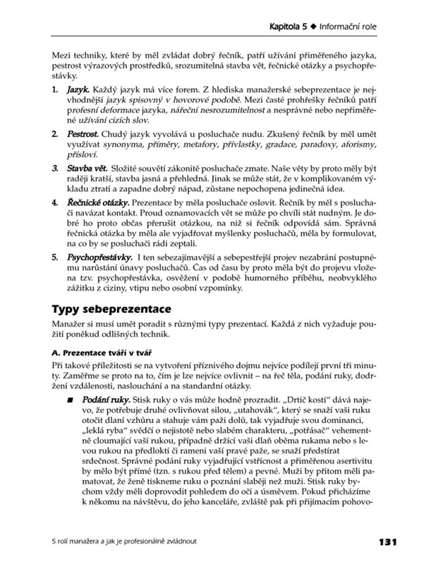 Publikace nabízí jedinečný pohled na práci manažera. Věnuje se pěti oblastem – rolím, jež byste měl/a/ jako dobrý řídící pracovník bezpečně ovládat. Které to jsou?