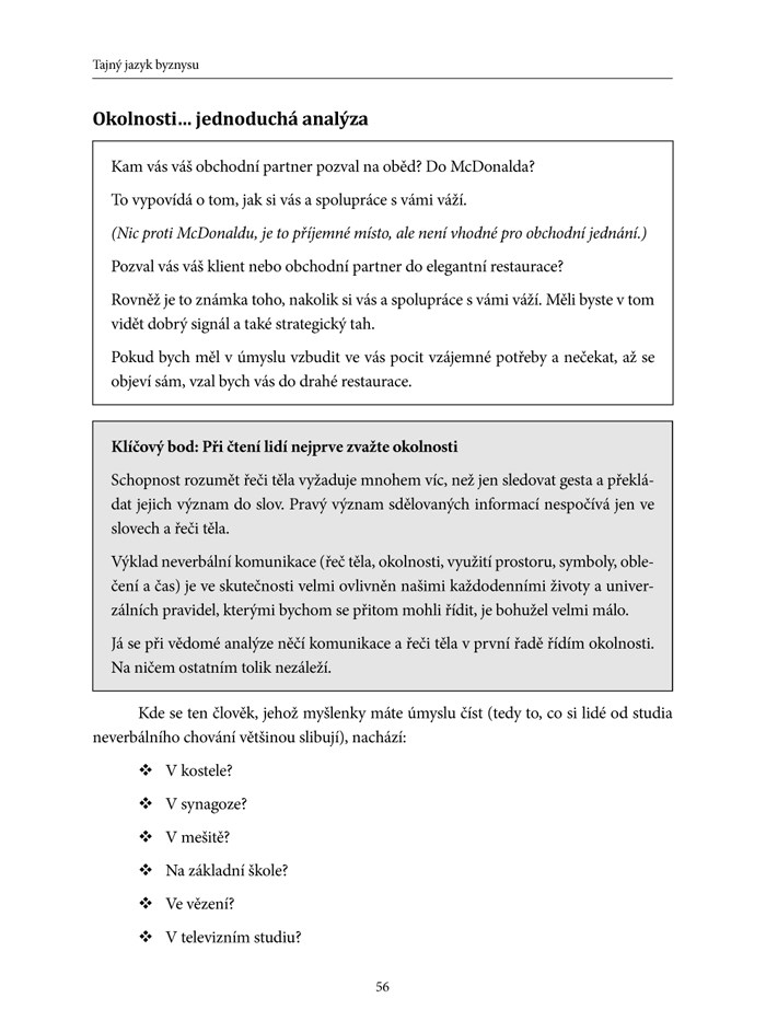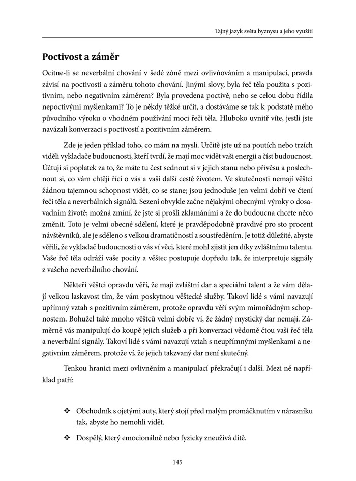 Publikace je určena manažerům, obchodníkům a všem lidem, kteří mají zájem o hlubší pohled do problematiky neverbální komunikace. Autor využil svých dlouholetých zkušeností v této oblasti a napsal knihu seriózní a současně poutavou; pro čtenáře užitečnou v jejich práci i soukromém životě. Po přečtení knihy Tajný jazyk byznysu čtenář: