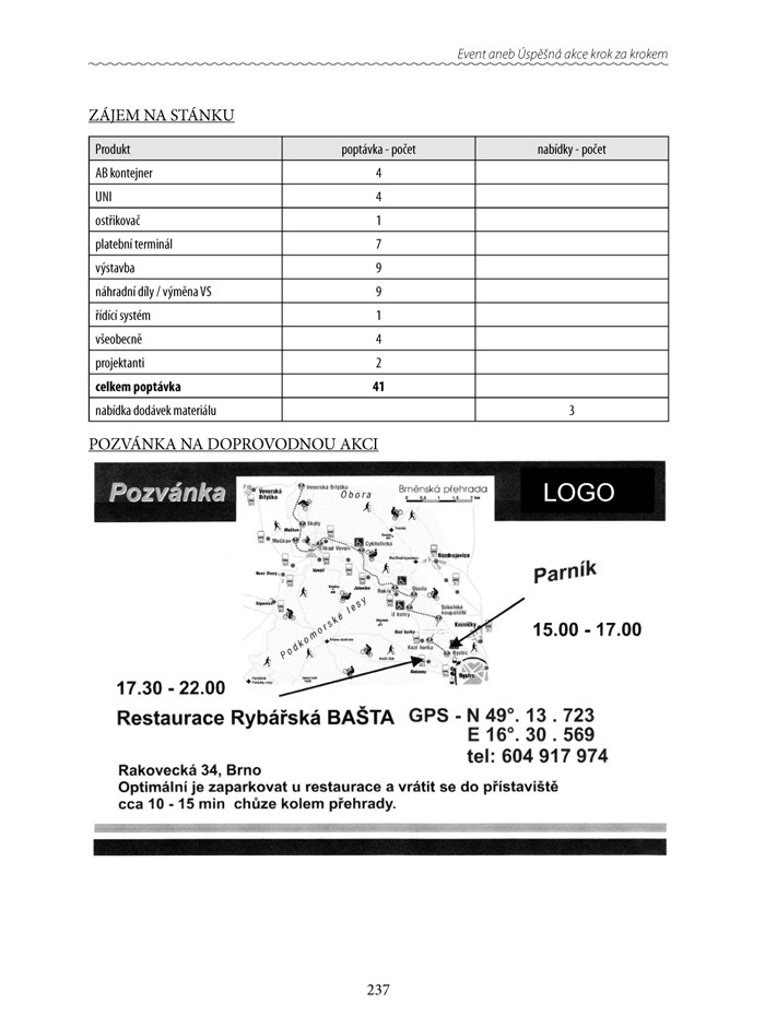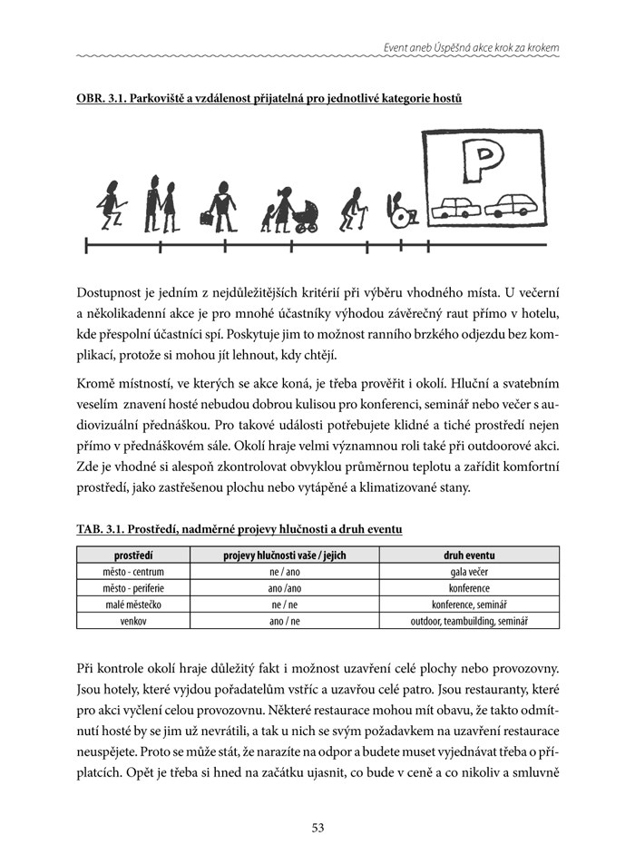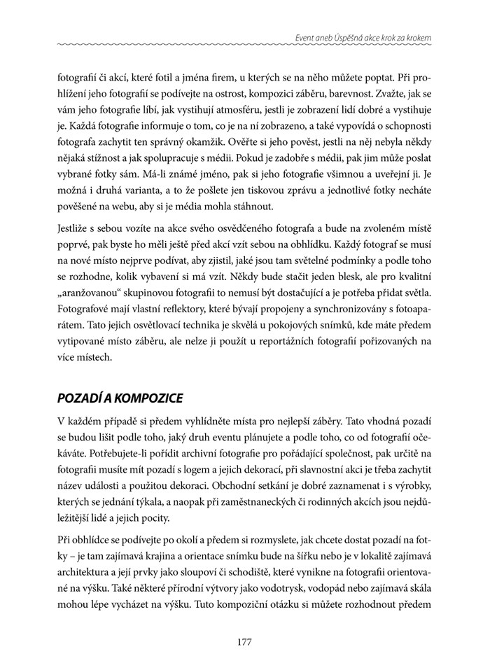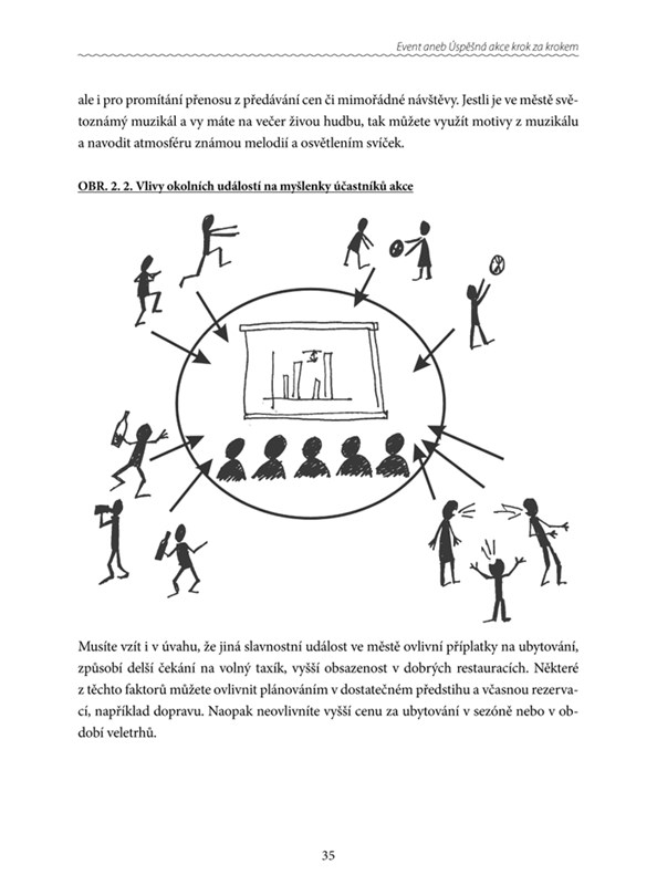 Tato kniha vás bude hned na začátku nabádat, abyste si zodpověděli otázku, proč chcete event pořádat. Podle toho pak volíte konkrétní druh akce, například seminář, konferenci, společenský večer, promotion, sportovní odpoledne pro zaměstnance, vánoční posezení. Kromě toho, že vám publikace představí i další druhy eventů, provede vás jednotlivými fázemi organizace a upozorní na vše podstatné, co byste neměli zapomenout. Poradí například s tím: