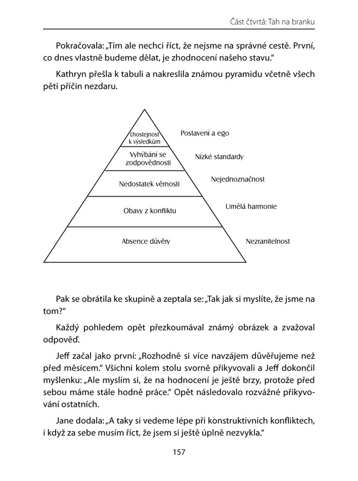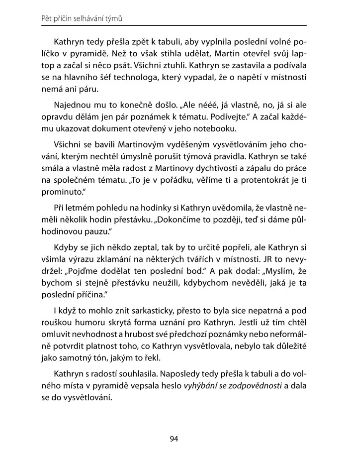 Příběh ze světa týmového prostředí, který nám vypráví Patrick Lencioni, není pouze poutavý a čtivý, ale také nám připomíná, že vůdcovství vyžaduje stejně tolik odvahy jako pochopení. Během tohoto vyprávění autor postupně odhaluje a do hloubky rozebírá pět oblastí, se kterými mají týmy, a to dokonce i ty nejlepší, problémy. Ukazuje účinný model a konkrétní akční kroky, které lze podniknout ke zdolání těchto obecných překážek a k vybudování kompaktního a efektivního týmu.