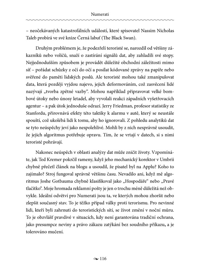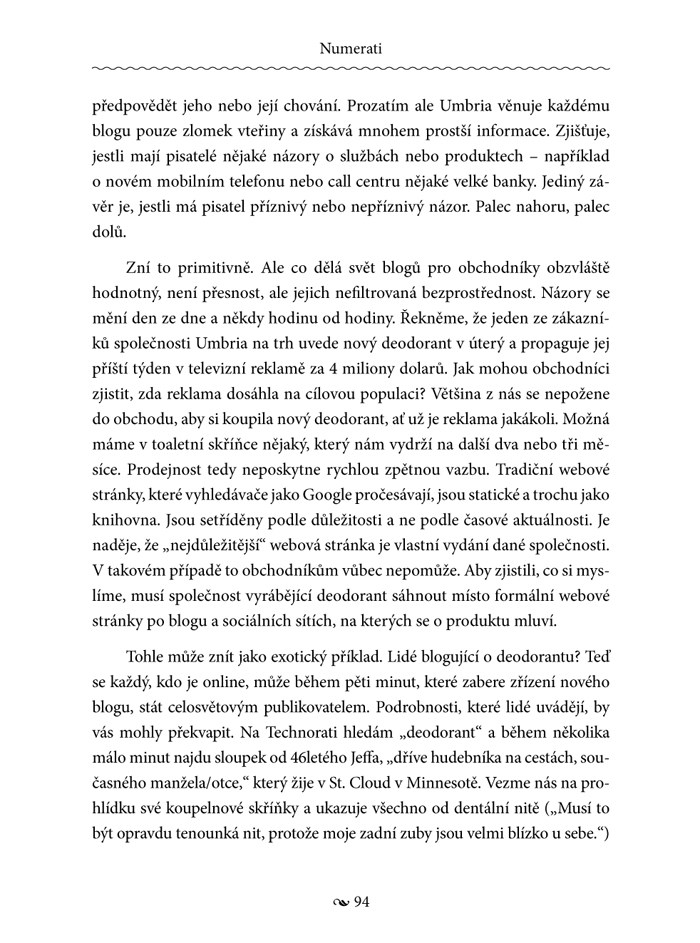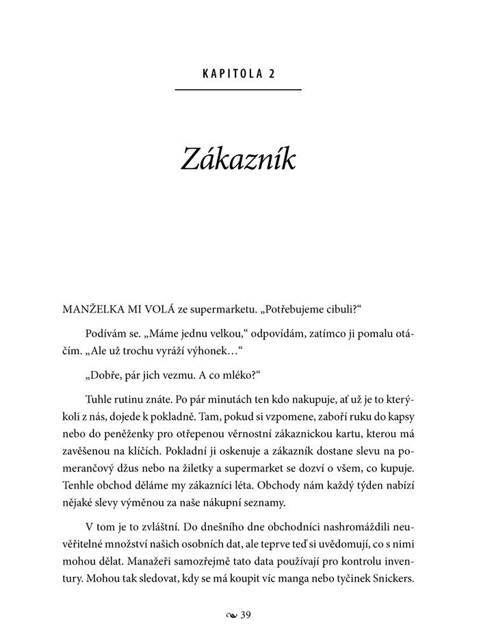 Pracujete na počítači, klikáte na webové stránky, nakupujete kreditními a platebními kartami, voláte z mobilního telefonu… A přesto si stále myslíte, že vaše soukromí je dokonale chráněno? Tato kniha vás vyvede z omylu. Společnosti jako Yahoo! a Google nasbírají každý měsíc v průměru 2500 podrobností o každém z nás. Nová matematická inteligence, tzv. Numerati, pak tato data „pitvá“. A proč? Snaží se zmanipulovat naše chování – co kupujeme, jak volíme, koho milujeme – aniž bychom si to uvědomili.
