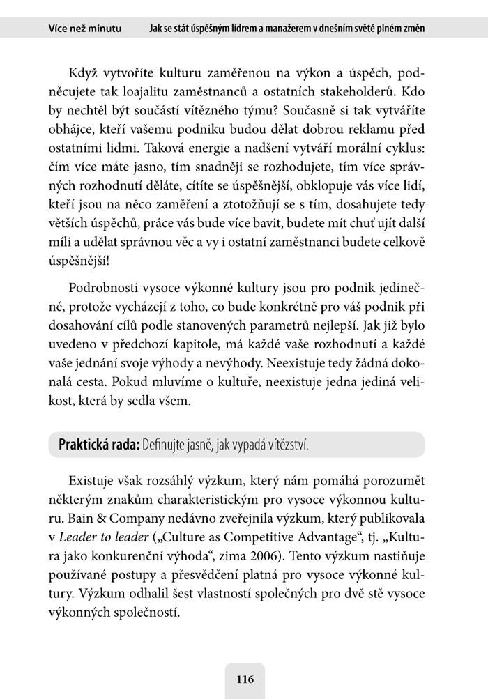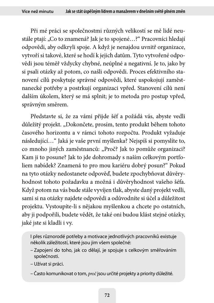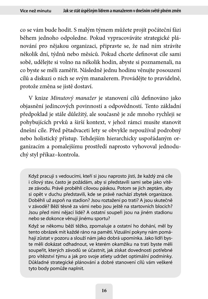 Kniha Více než minutu nabízí nový pohled na časem prověřené praktiky leadershipu popsané v téměř třicet let starém bestselleru Minutový manažer. Neotřelým způsobem se dívá na současný svět, ve kterém je všechno otázkou okamžiku a od každého se tu očekává, že bude „běhat ještě dřív, než se naučil chodit“. Tato kniha vám pomůže: