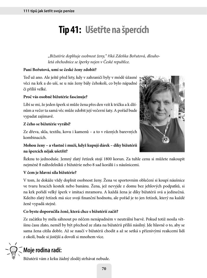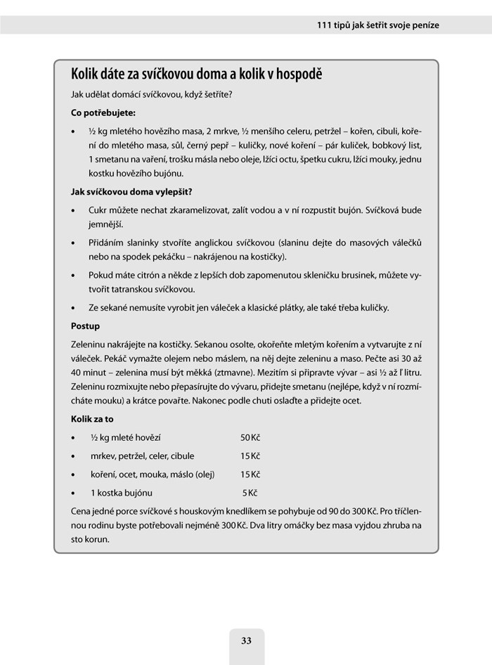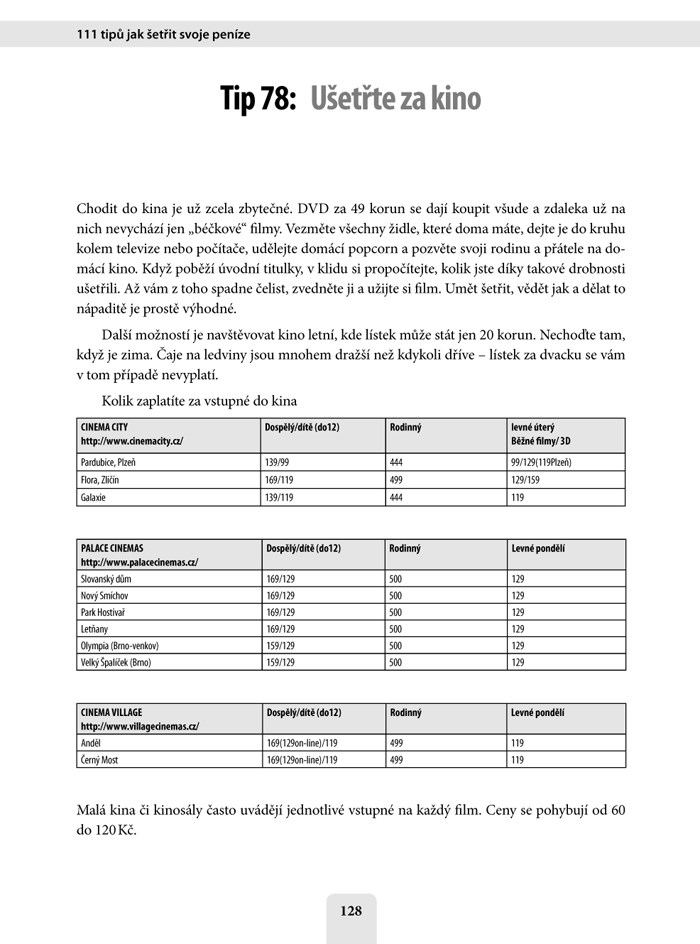 Kniha 111 tipů, jak šetřit vaše peníze není jen 111 tipů. Tahle kniha vysvětluje princip, jak šetřit. Naučí vás dívat se na šetření a na vaši i světovou finanční krizi s nadhledem. Poradí vám, jak dělat praktické věci zajímavě a jak se umět bavit tím, že nic nemáte. Vysvětlí vám, jak z ničeho udělat moc a jak to moc využít naplno. Tato kniha je pro lidi, kteří se chtějí naučit šetřit.