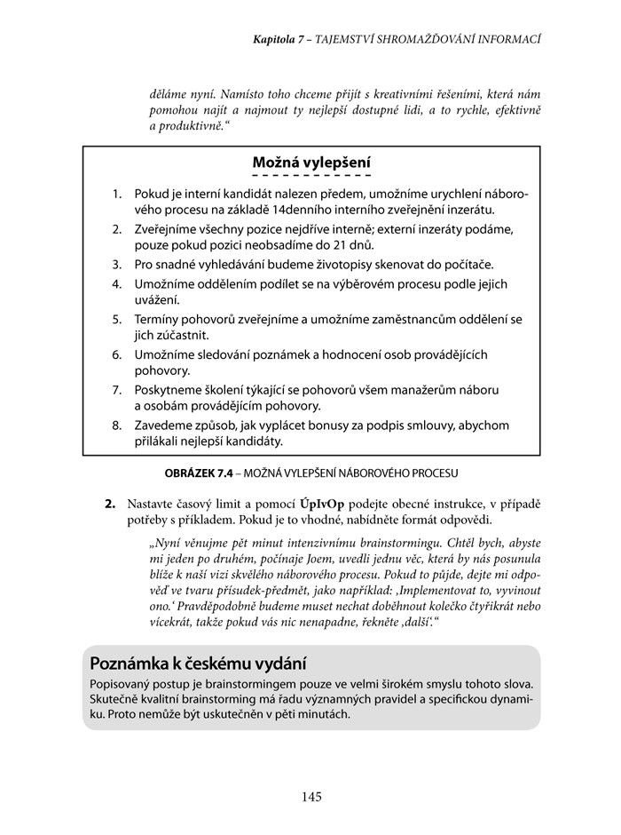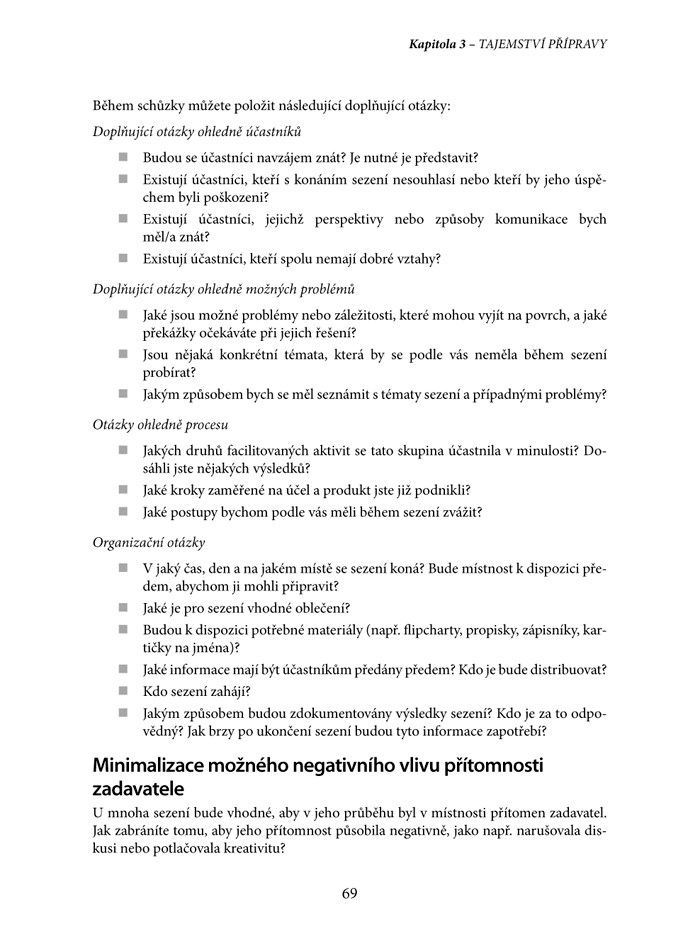 Autor ve třinácti kapitolách odhaluje celkem šedesát tajemství úspěšné facilitace, jež shrnují klíčové dovednosti, rozhodující o úspěchu či neúspěchu facilitátora a facilitace. Dozvíte se, jak se na facilitaci připravit, jak facilitované setkání otevřít a postupně vést k závěru. Zvláštní pozornost věnuje řešení běžných potíží, s nimiž se facilitátoři při své práci setkávají, a kontrole dynamiky skupiny a procesu facilitace.“