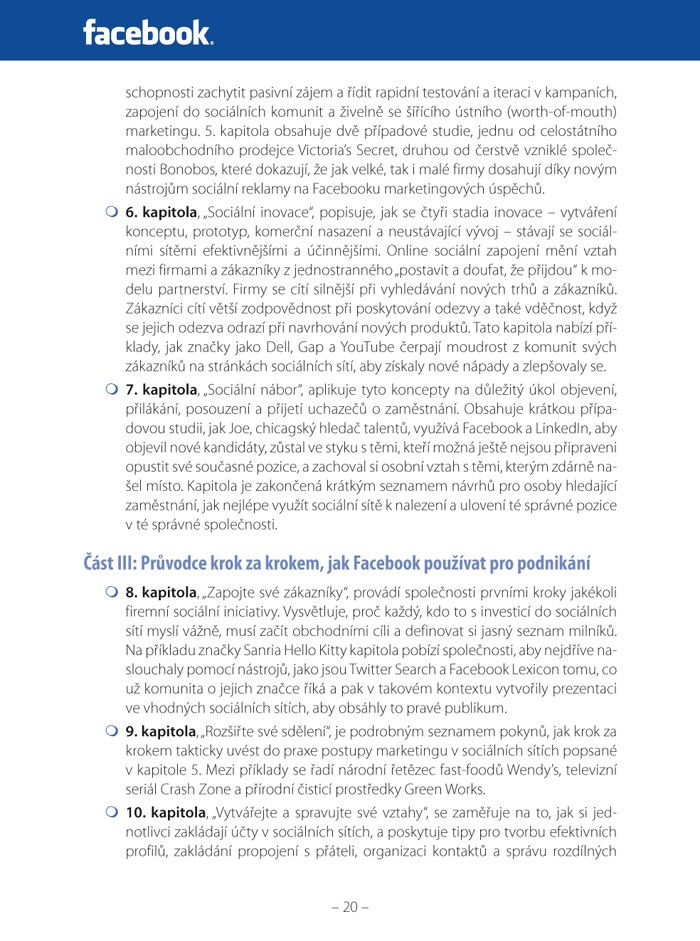 Pokud chce firma využívat nejaktuálnější marketingové taktiky, neobejde se bez poznání online sociálních sítí. Díky knize Vydělávejte na Facebooku může i nováček a technický laik ovládnout triky, pomocí nichž všechny přednosti sociálních sítí využije k vybudování široké klientely spokojených zákazníků a upevnění vlastní značky. Stejně tak se naučí ubránit před nástrahami internetu a zdánlivé nevýhody obrátit ve svůj prospěch.